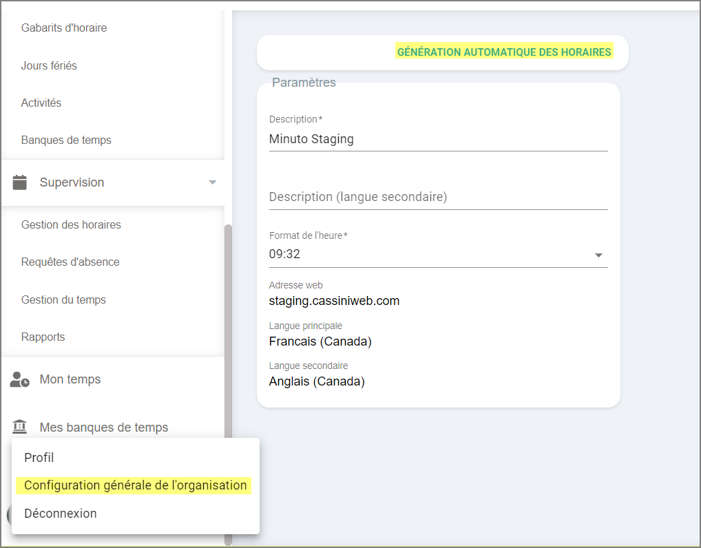Cette page permet de consulter et/ou modifier les paramètres généraux relatifs à l'ensemble des entités de votre organisation. C'est aussi à partir de cette page que vous pourrez modifier les paramètres de génération automatique des horaires. La configuration initiale de ces paramètres a été effectuée au moment de la mise en route de l'application.