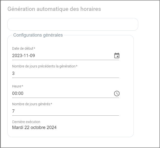 Astuce : afin de savoir à quel moment doit se produire la génération automatique et pour combien de temps, il est pertinent de se demander : à partir de quel moment mes employés doivent-ils pouvoir consulter leur horaire? Par exemple, ils doivent pouvoir avoir leur nouvel horaire de travail pour la période suivante 1 semaine en avance, ou bien 5 jours d'avance, etc.
