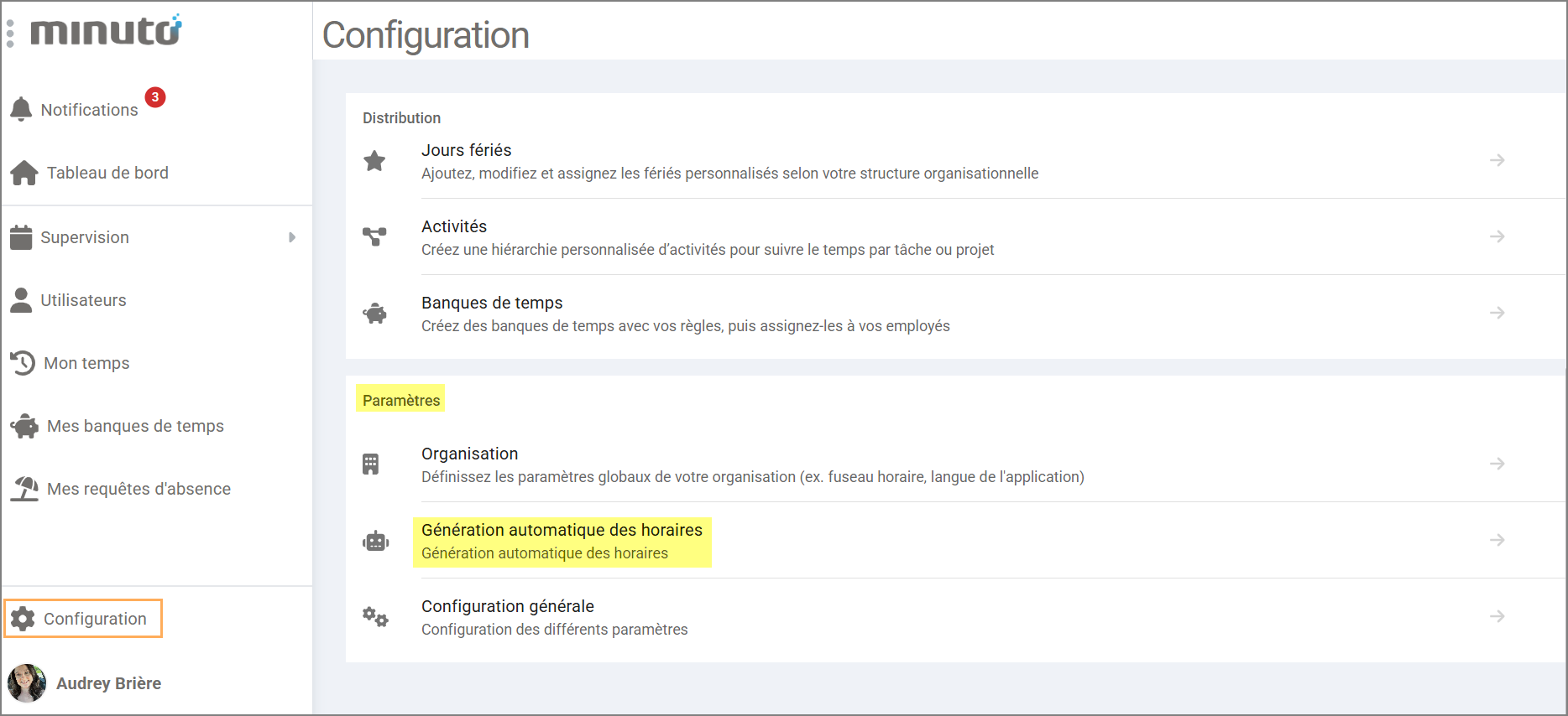 Dans la section Paramètres, cliquez sur l’option Génération automatique des horaires.