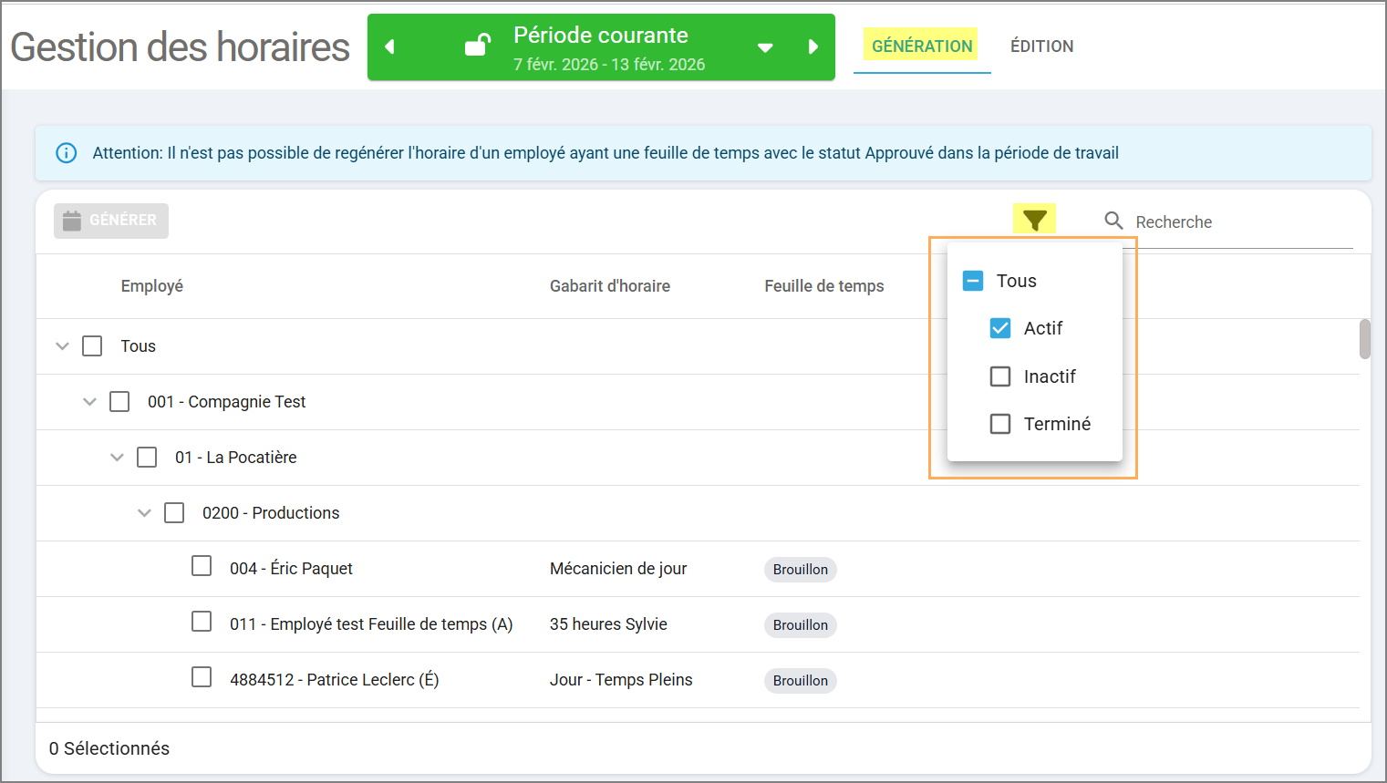 Lors de la génération des horaires, seuls les employés ayant un statut actif au début de la période sont affichés. Pour afficher ceux qui sont inactifs ou terminés, il suffit de cliquer sur le filtre situé en haut à droite de l'écran et de sélectionner les options désirées.