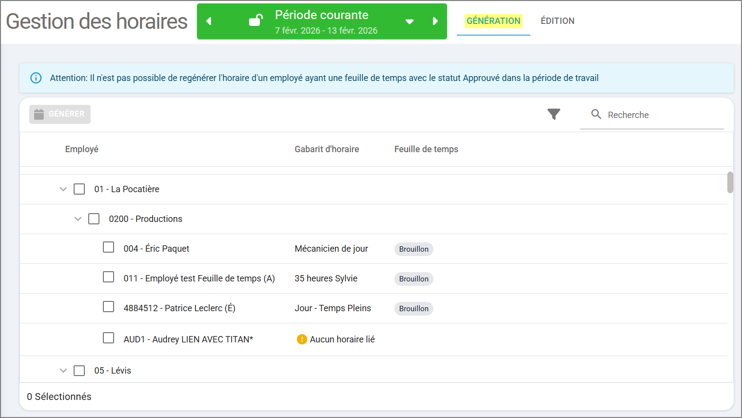 Cochez la case située à droite de l'employé ou de l'entité pour laquelle vous souhaitez générer l'horaire. Un