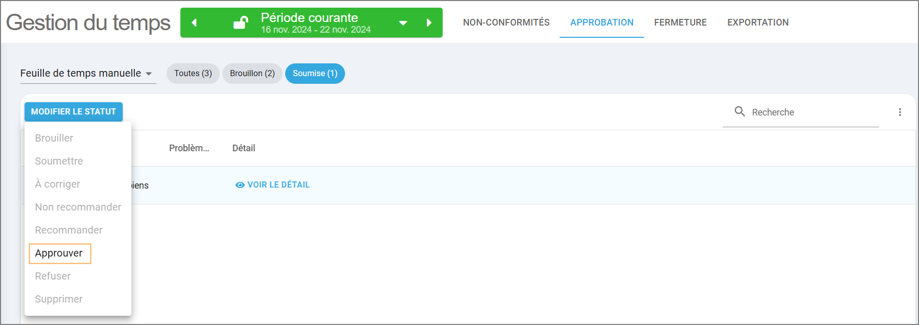 Accédez à l'onglet approbation via la section gestion du temps du menu principal.