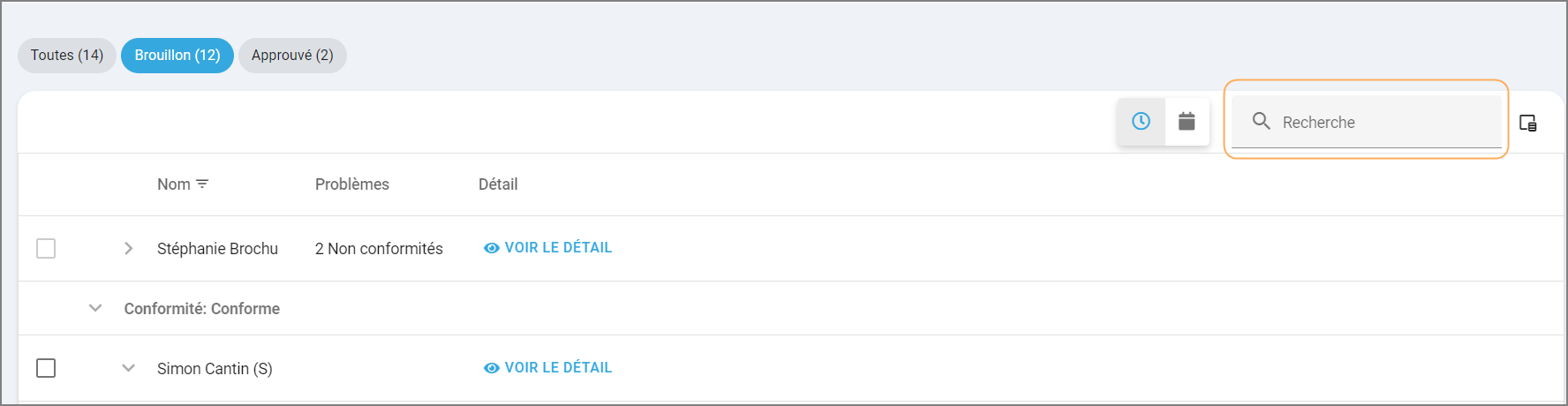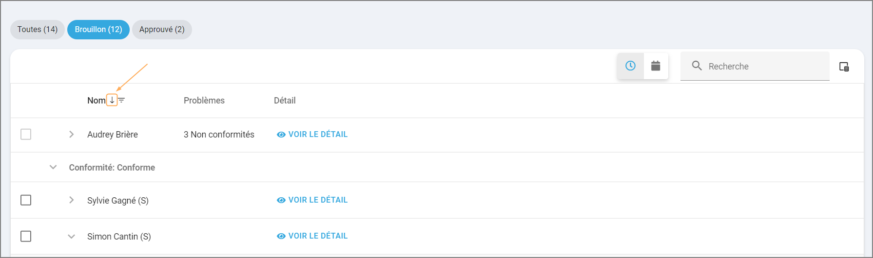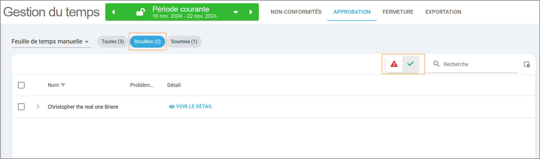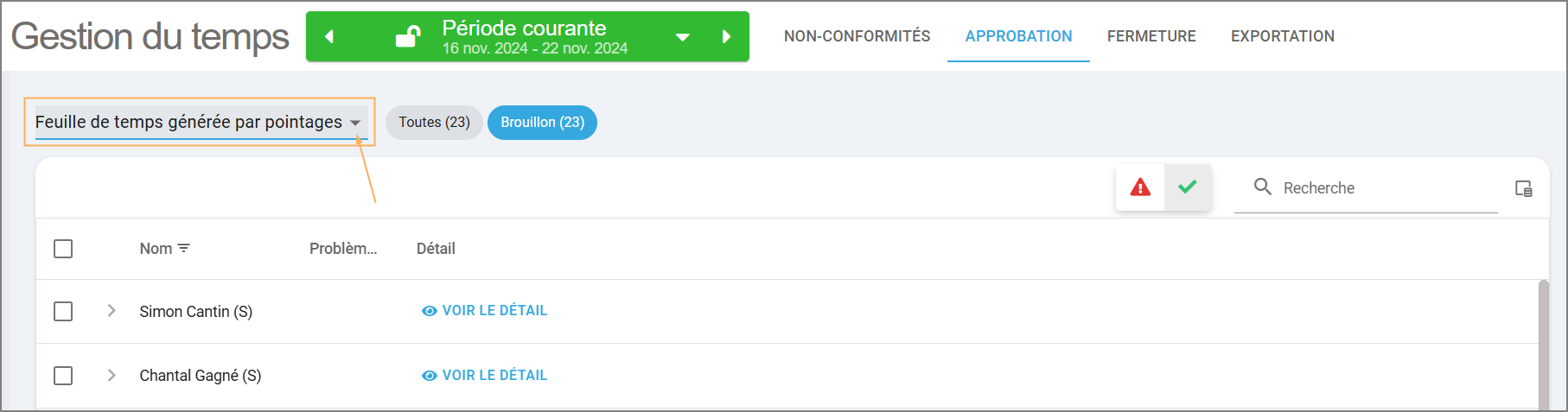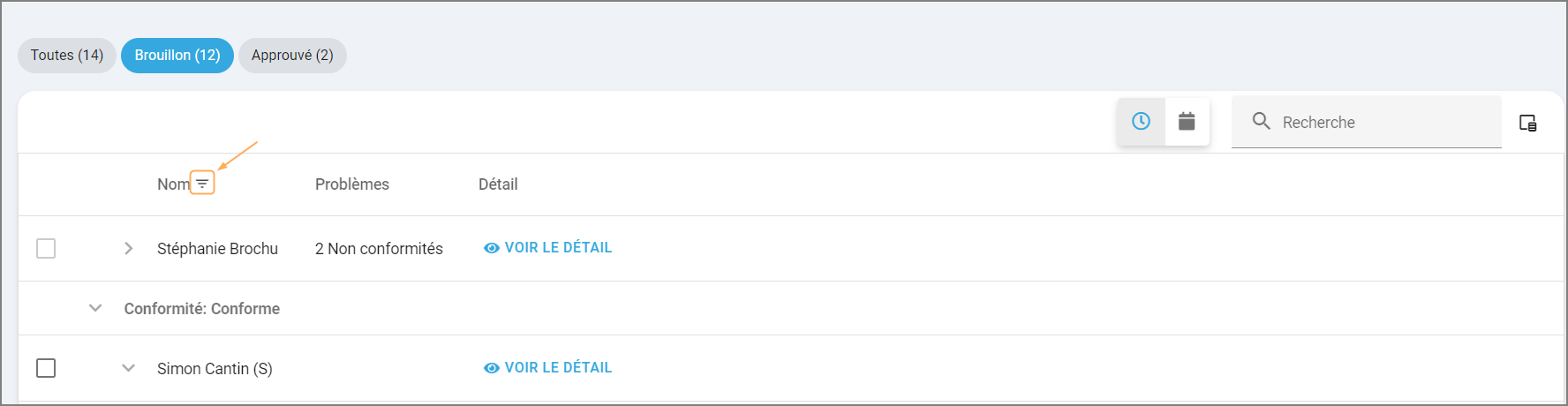 En cliquant sur les lignes d'entonnoir, vous avez la possibilité de filtrer vos feuilles de temps par les conformes ou bien les non conformes. Ainsi, vous pouvez repérer facilement ceux qui restent des corrections à faire afin de finaliser l'approbation des feuilles de temps et, par la suite, effectuer la fermeture de votre période.