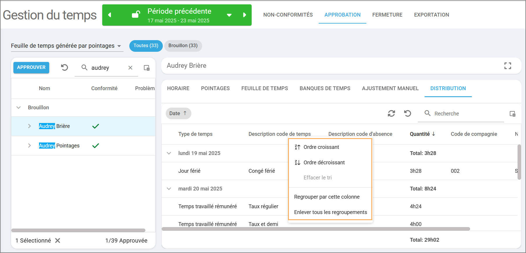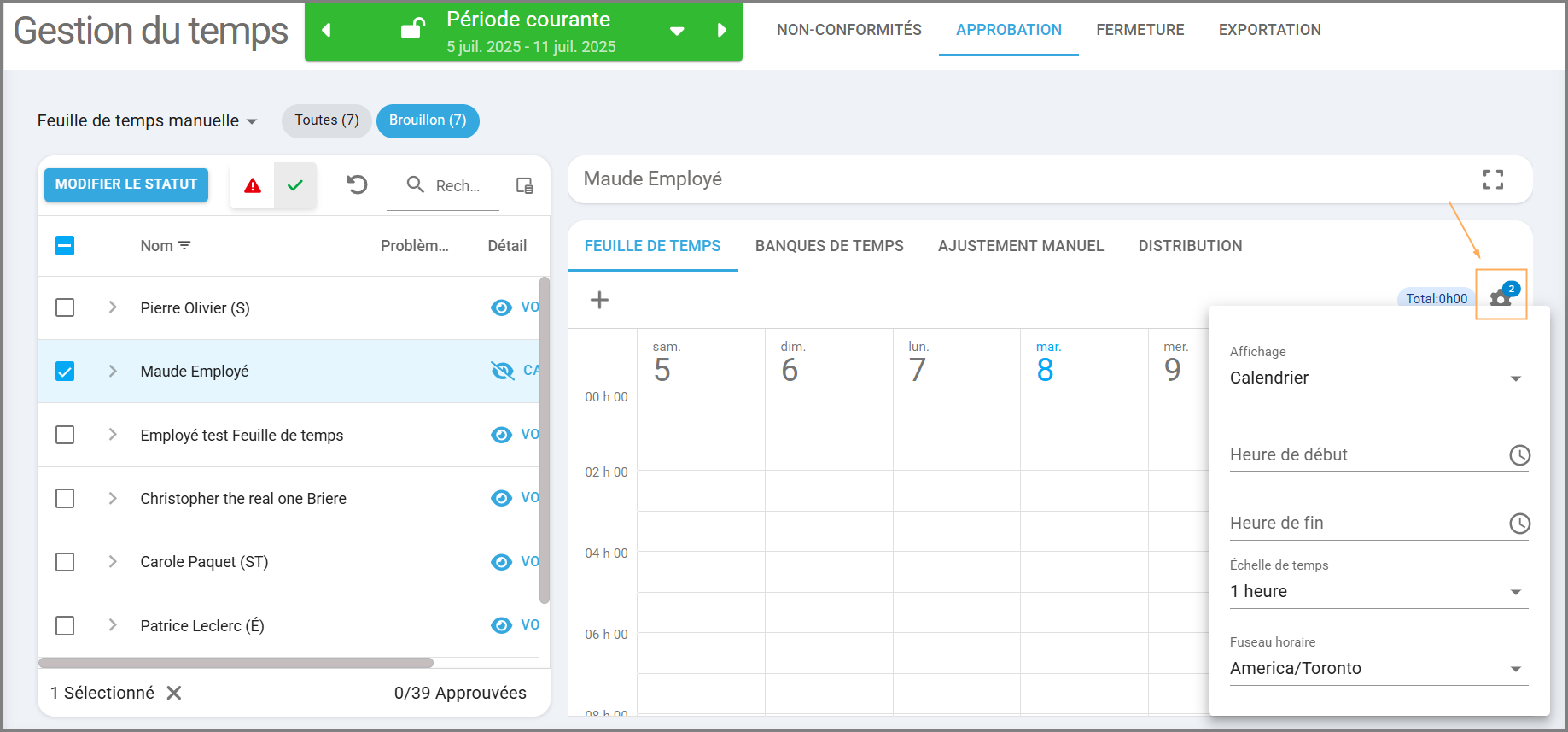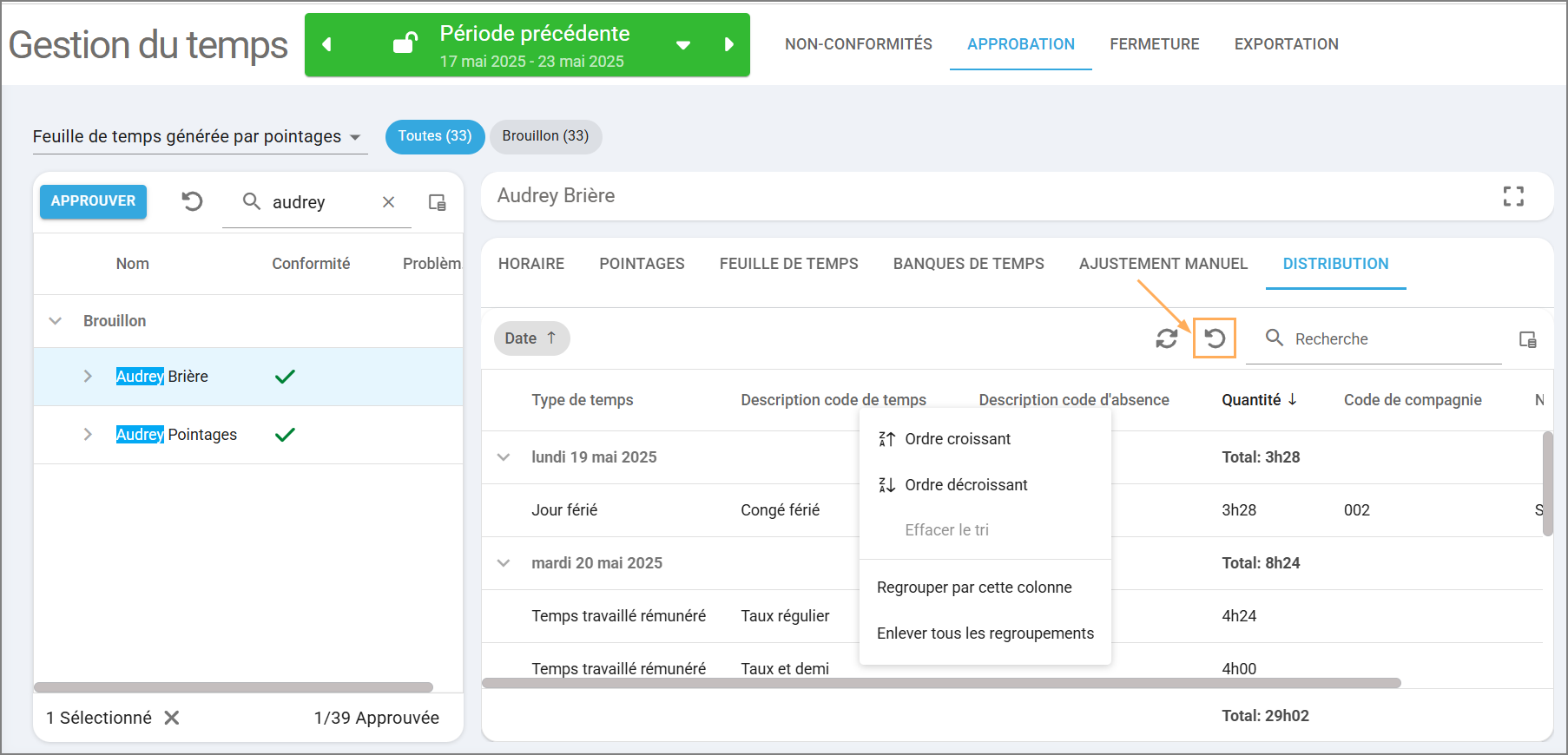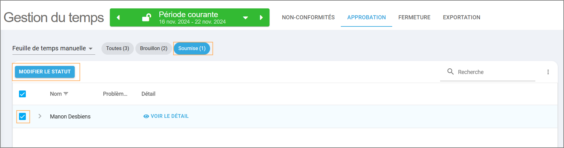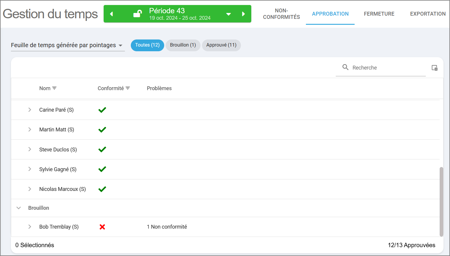 En cliquant sur les lignes d'entonnoir, vous avez la possibilité de filtrer vos feuilles de temps par les conformes ou bien les non conformes. Ainsi, vous pouvez repérer facilement ceux qui restent des corrections à faire afin de finaliser l'approbation des feuilles de temps et, par la suite, effectuer la fermeture de votre période.