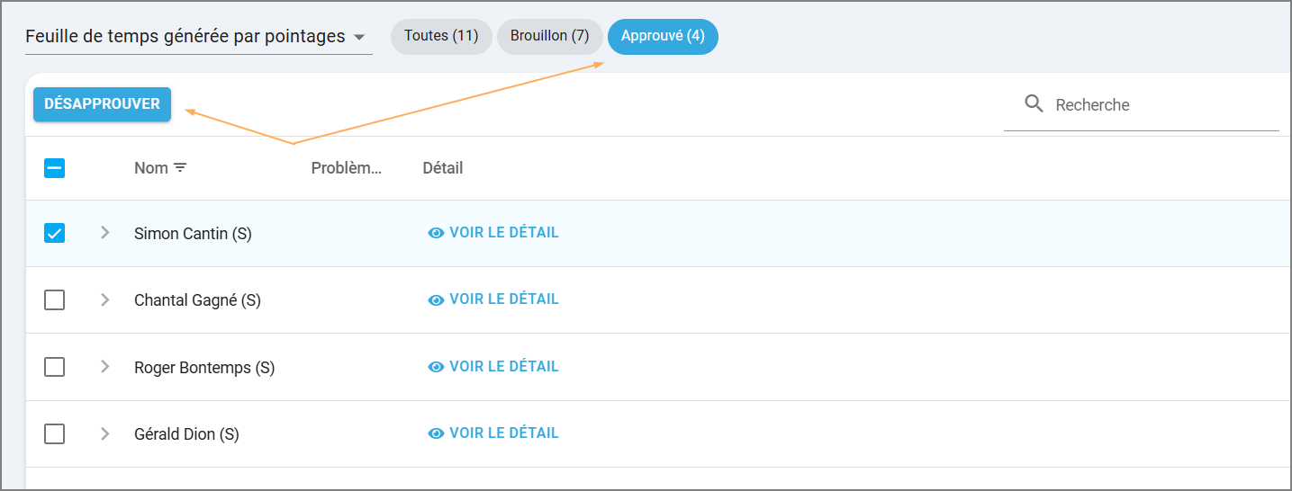 Il est toujours possible de désapprouver la ou les feuilles de temps. Pour ce faire, vous devez cliquer sur le filtre Approuvé en haut de la grille. Sélectionnez ensuite le ou les employés désirés et cliquez sur le bouton Désapprouvé en bleu.