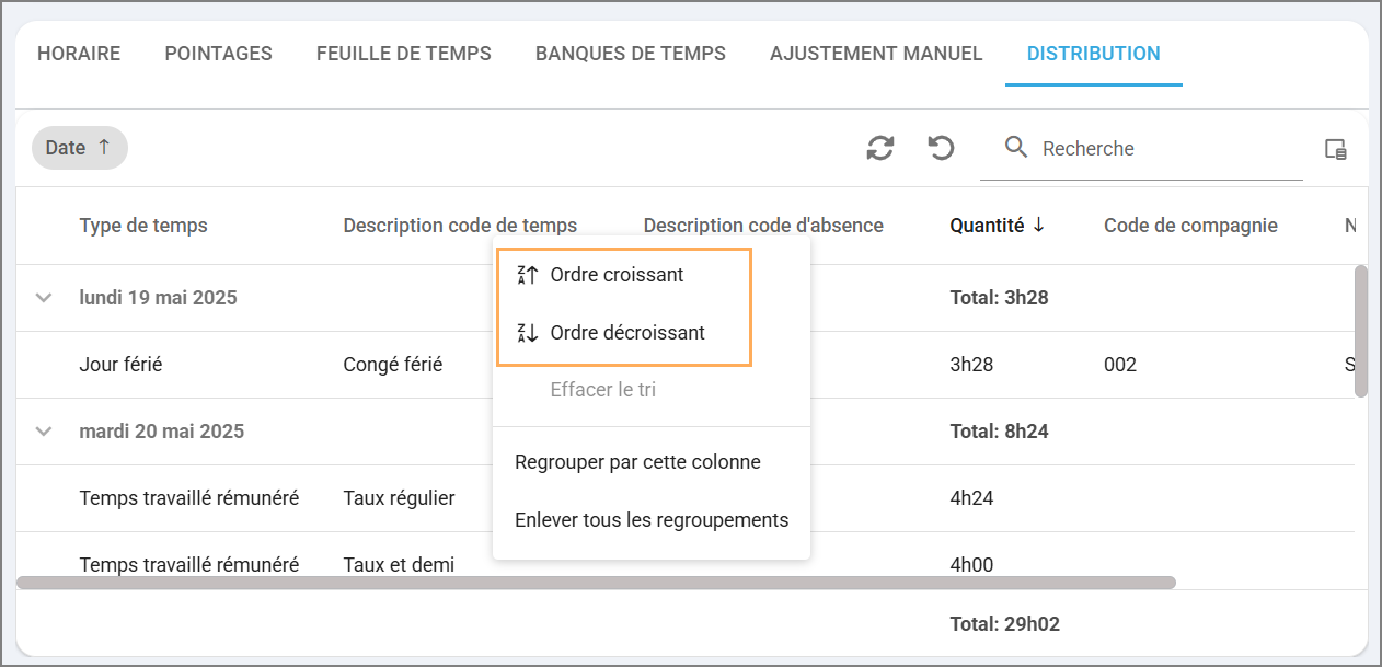 Une barre de recherche a été ajoutée dans le haut de la grille. Elle permet de rechercher du texte dans toutes les colonnes à la fois. Tapez un mot ou une partie de mot, et les résultats s’affichent instantanément!