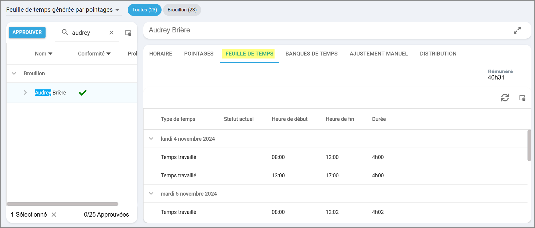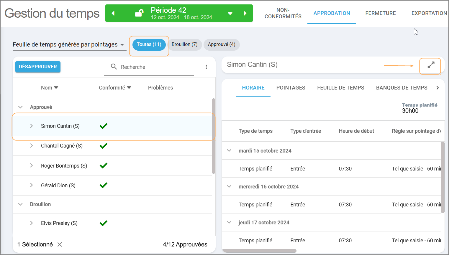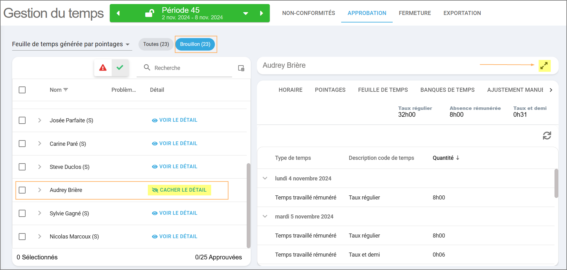 Dans la page approbation des feuilles de temps, vous pouvez visualiser les détails relatifs aux pointages des employés supervisés et vous pouvez procéder à l'approbation finale de celles-ci.