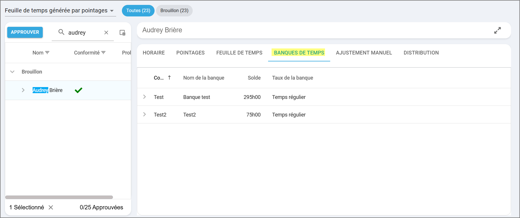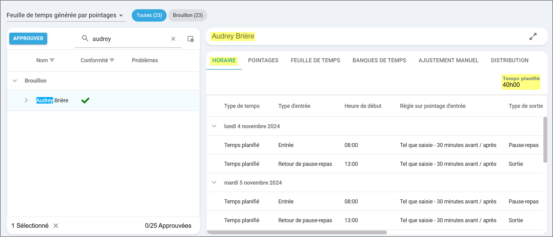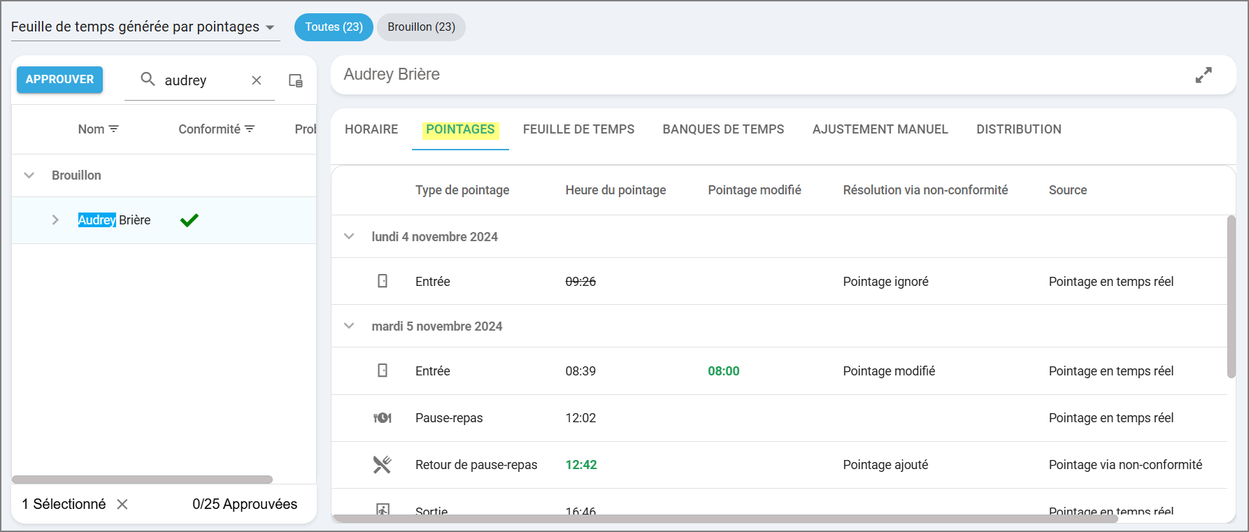 Dans la page approbation des feuilles de temps, vous pouvez visualiser les détails relatifs aux pointages des employés supervisés et vous pouvez procéder à l'approbation finale de celles-ci.