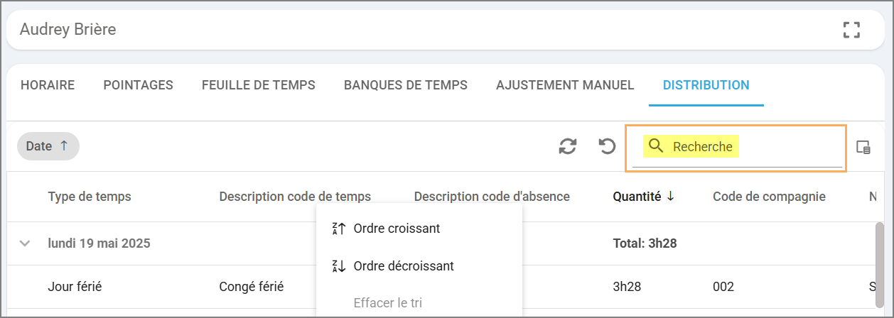 Une barre de recherche est disponible dans le haut de la grille afin de faciliter vos recherches. Vous pouvez entrer n'importe quelles données (Code employé, nom, etc.) et le système va afficher les résultats selon les paramètres entrés.