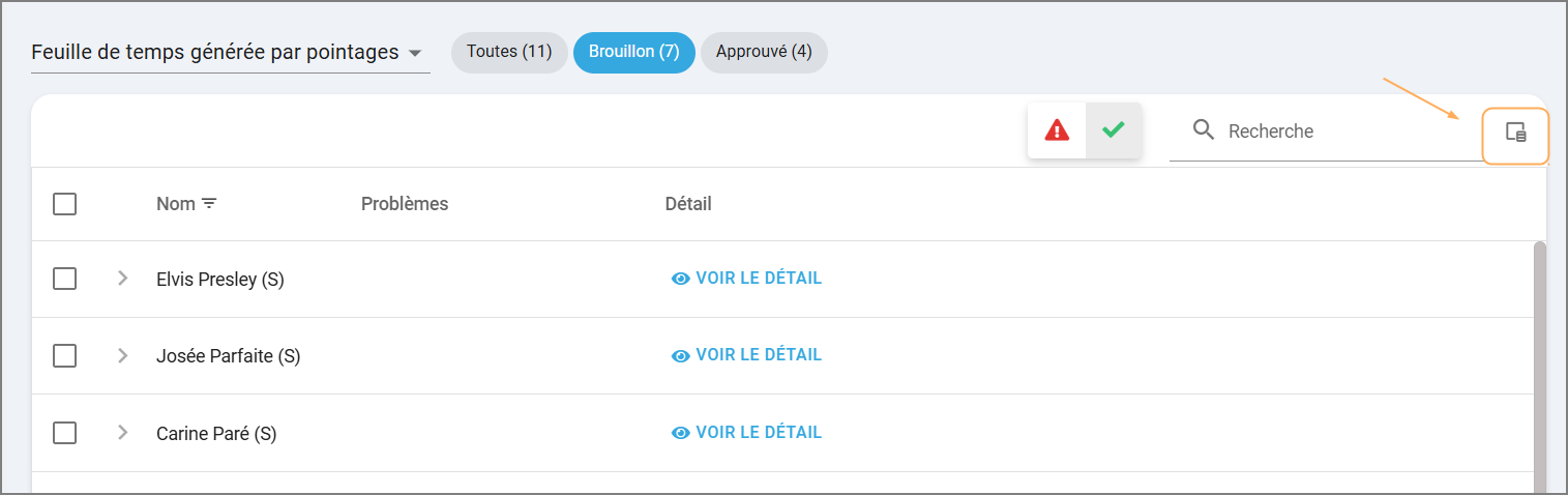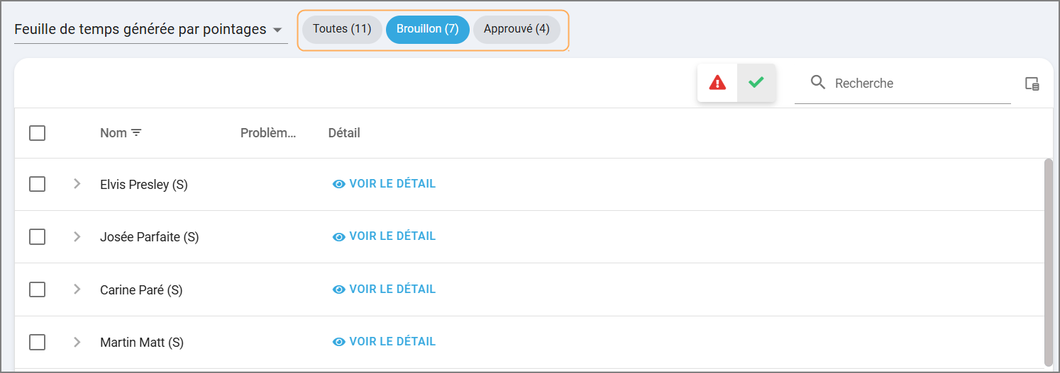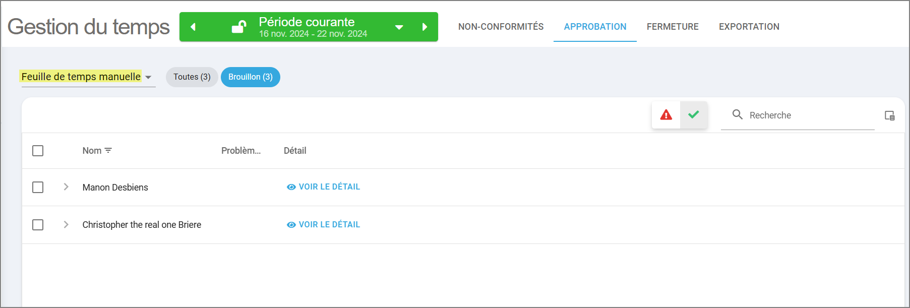Toutefois, si toutes les non-conformités pour cet employé ont été résolues, ce sera un qui apparaîtra dans cette même colonne. La colonne problème vous indique la ou les raisons pour lesquelles vous ne pouvez pas approuver la feuille de temps.