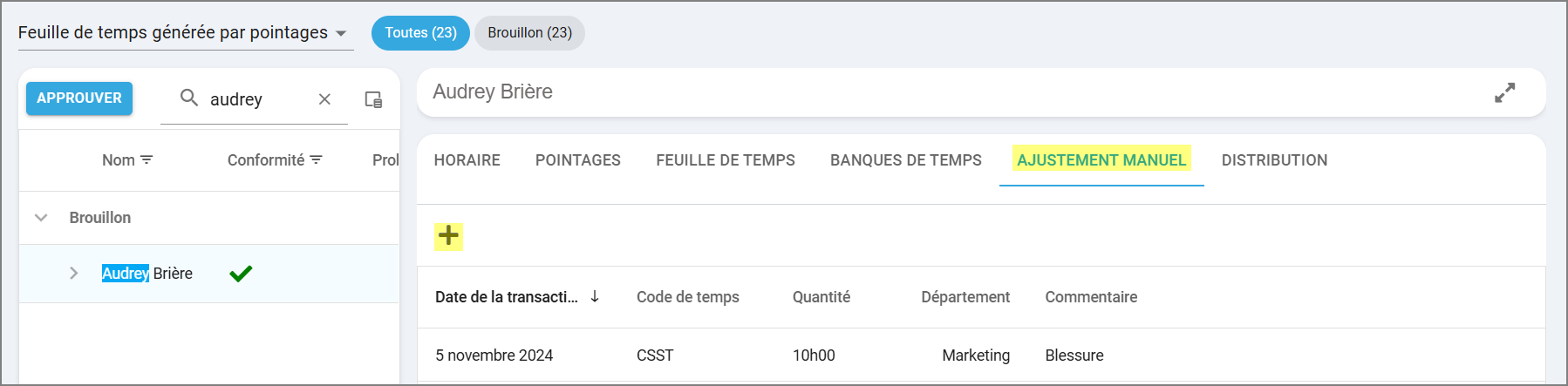 Voici les étapes simples afin d'ajouter un ajustement manuel à la feuille de temps de votre employé.