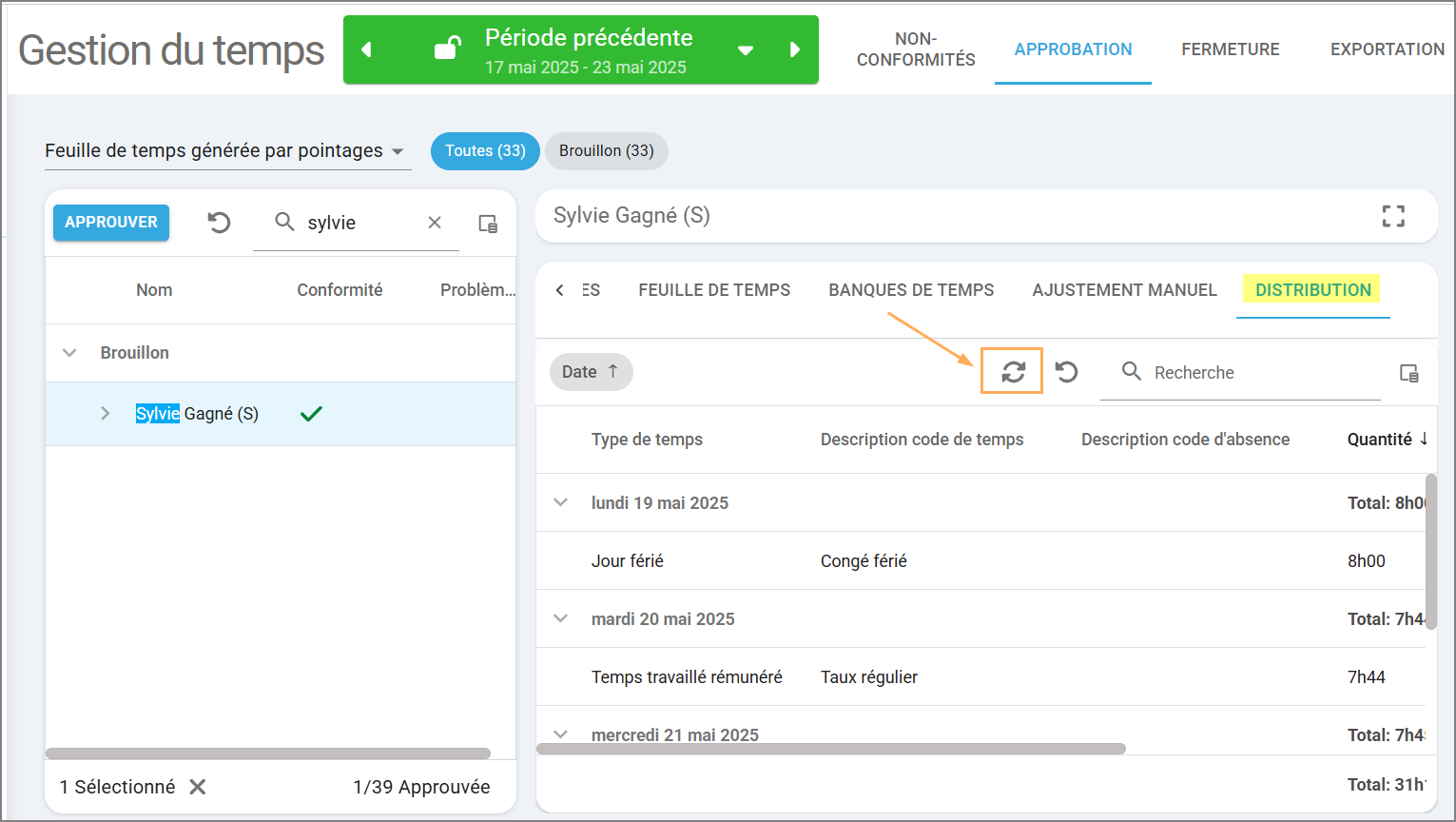 L’icône de flèche en rond permet de générer manuellement la distribution. Il est recommandé de le faire après tout changement dans les horaires, les résolutions des non-conformités ou les requêtes d'absence, afin de visualiser l'impact immédiat sur la distribution des temps.