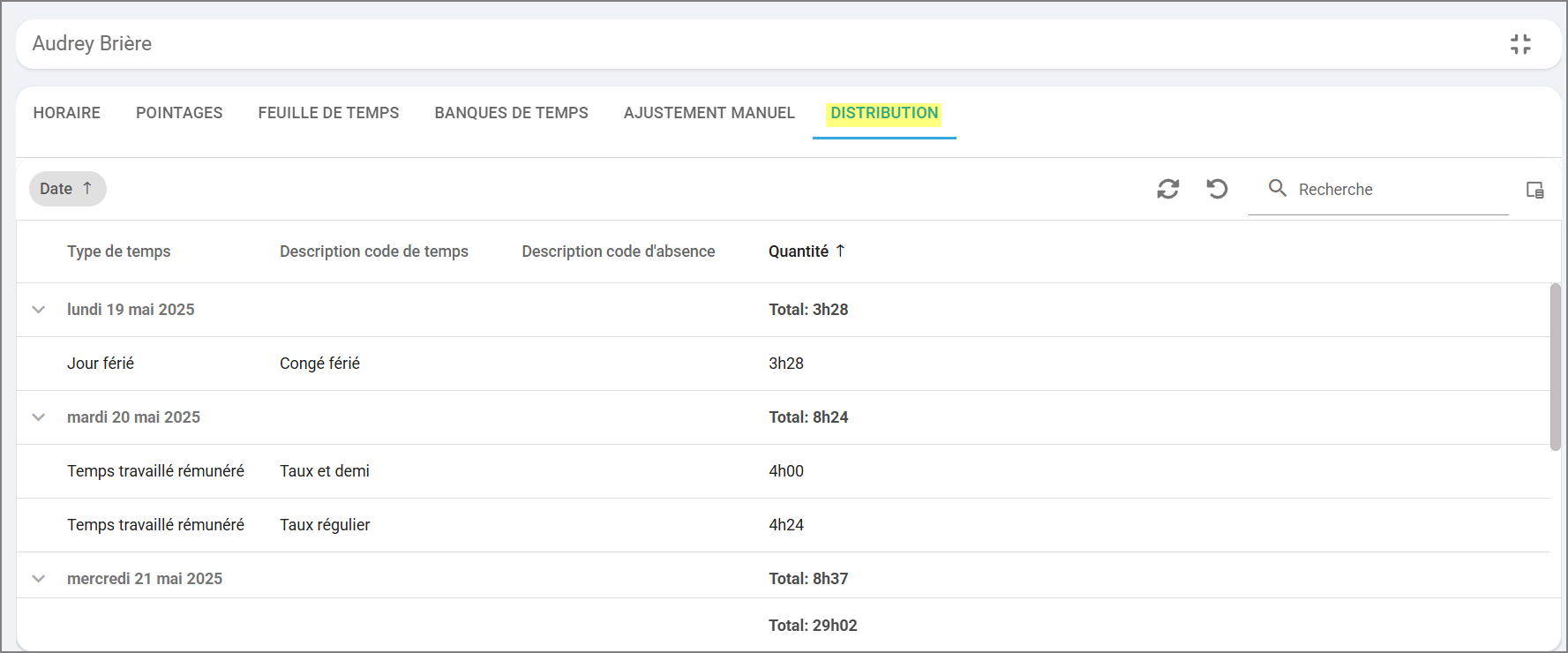 Afin de visualiser la feuille de temps d'un employé si vous êtes situé sur le filtre TOUTES, vous devez cliquer sur l'employé en question. Plusieurs informations vous seront alors accessibles en fonction du mode de collecte de temps de votre employé. Vous pouvez également y ajouter des ajustements manuels et y visualiser la distribution.