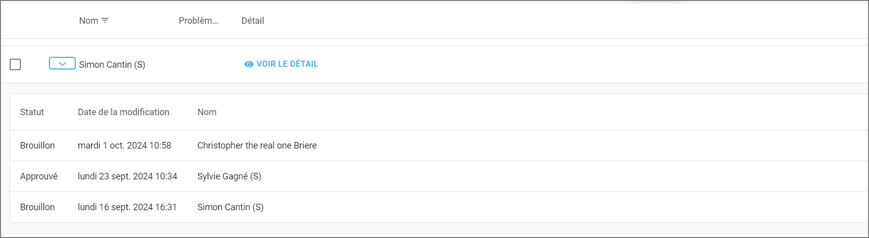 Si vous êtes situé sur un autre filtre que Toutes tel que Brouillon, Approuvé, vous devez cliquer sur Voir le détail afin d'afficher les informations précisés précédemment.