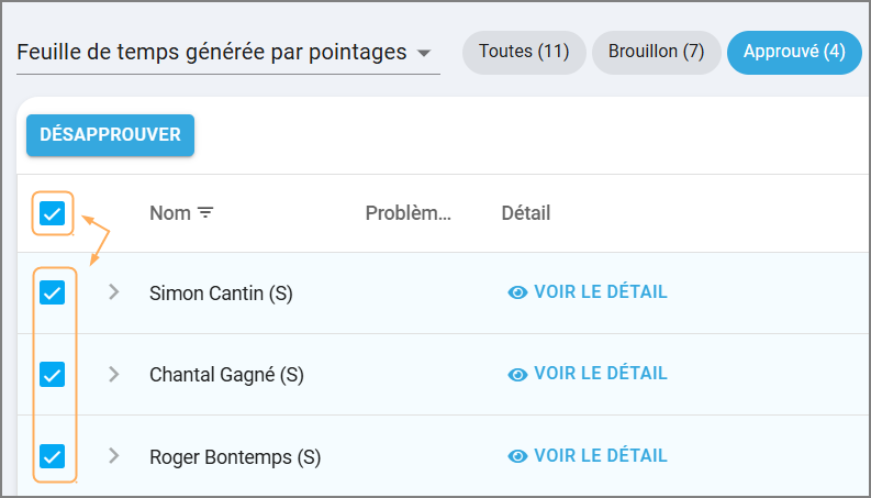 Vous pouvez également sélectionner manuellement plusieurs employés en cochant les cases à côté de leur nom directement, puis cliquer sur Approuver ou Désapprouver.