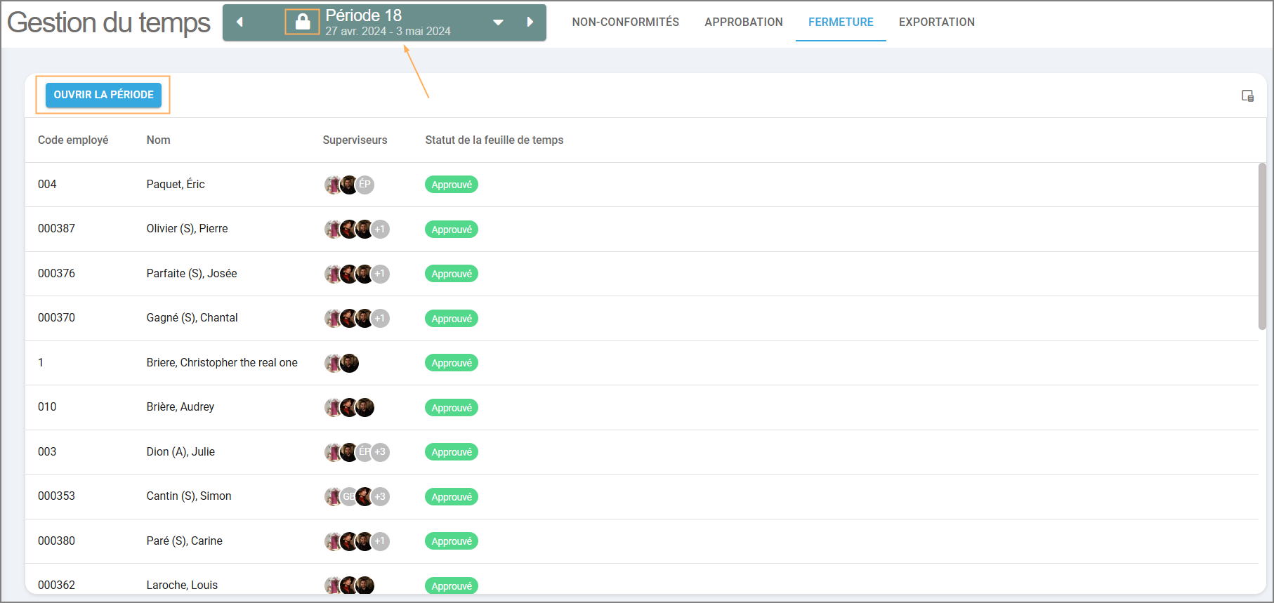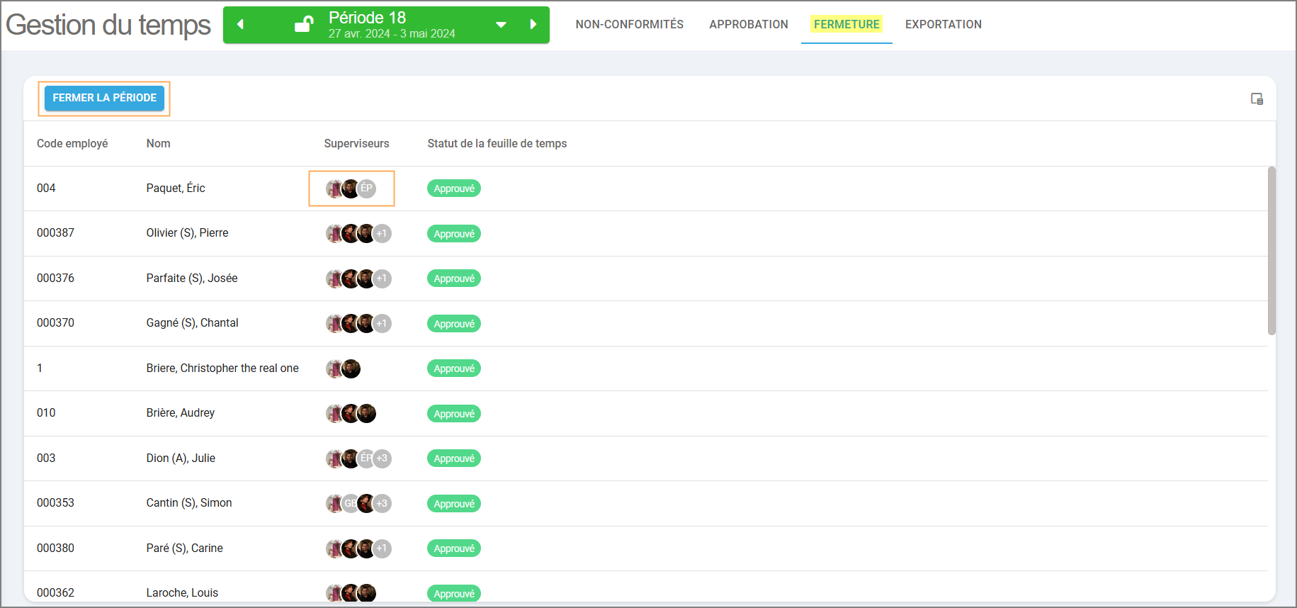 Seuls les administrateurs peuvent fermer une période. Vous pouvez facilement identifier les superviseurs des employés grâce à l'avatar qui apparaît à côté de leurs noms. Si un superviseur n’a pas approuvé les feuilles de temps, contactez-le directement.