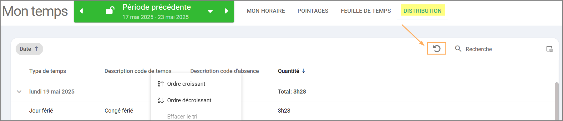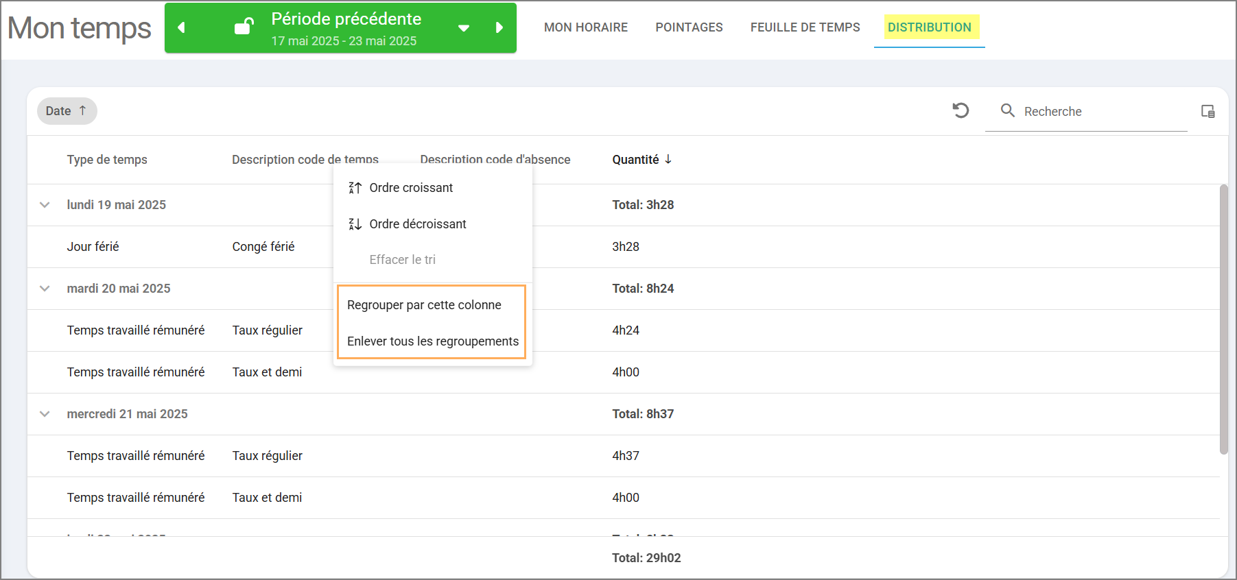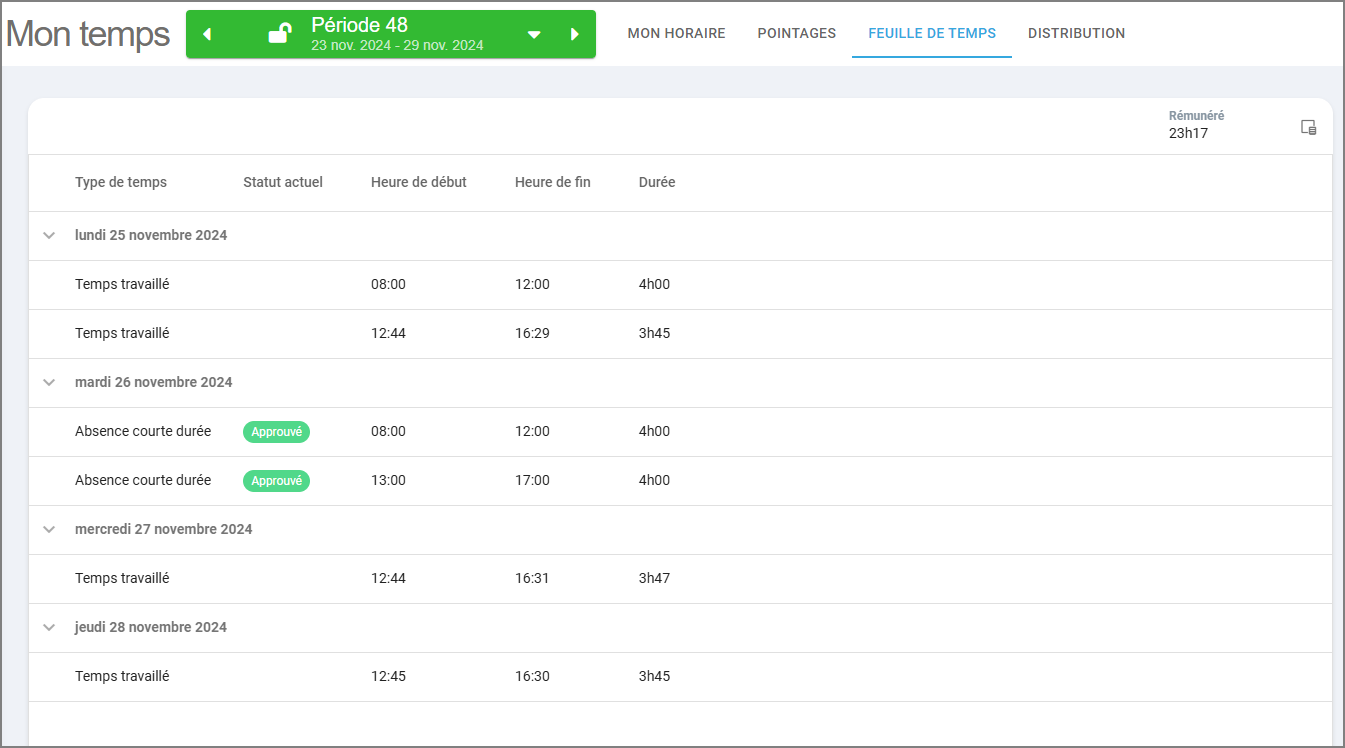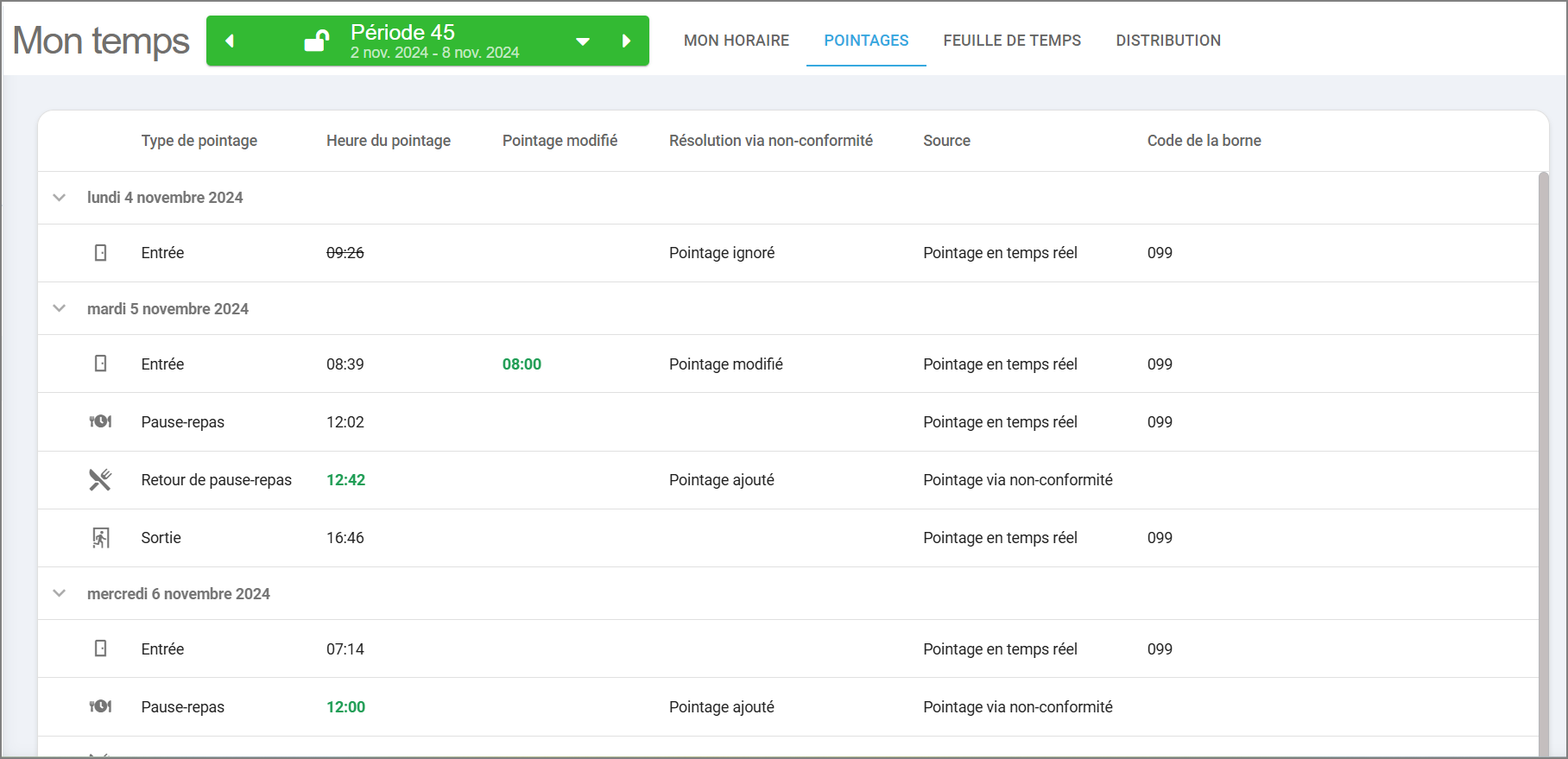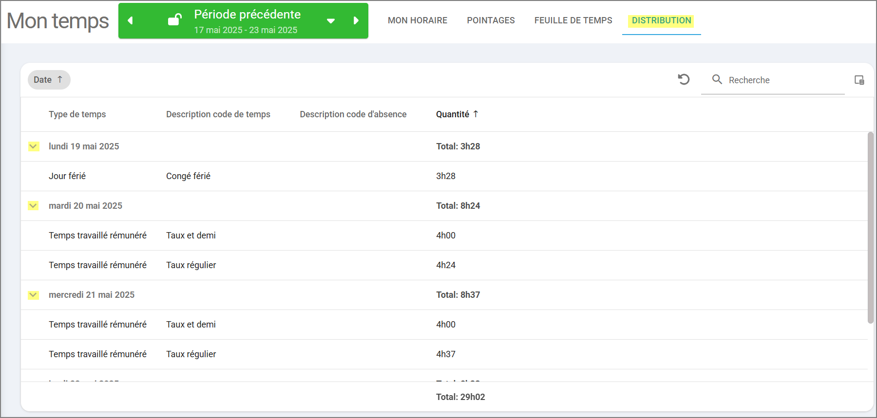 La page Mon temps vous donne un accès rapide à votre horaire, vos pointages, votre feuille de temps et votre distribution pour la période courante ou les périodes passés. Repérez facilement les erreurs sur vos pointages, les arrondissements ou la distribution avant l'envoi des données au logiciel de paie.
