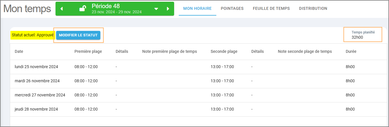 En haut à gauche, le statut de l’horaire est affiché. Celui-ci ne peut généralement pas être modifié, tout dépend de la configuration effectuée par votre gestionnaire pour la publication des horaires. Si vous avez à approuver votre horaire, c'est avec le bouton Modifier le statut que vous pourrez le faire.