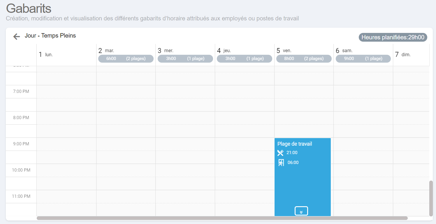 Les gabarits d'horaire servent à simplifier la gestion des horaires en générant automatiquement un horaire type pour les employés auxquels ils sont assignés. Un même gabarit peut être assigné à plusieurs employés et les modifications suite à la génération automatique peuvent s'effectuer à partir de la page Édition des horaires. Les gabarits d'horaire permettent aussi l'attribution des différentes règles relatives au traitement des pointages.