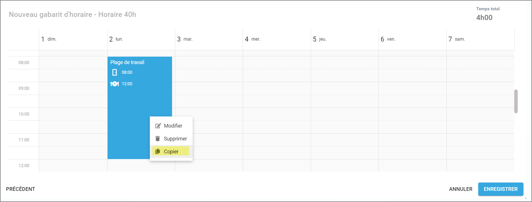 Par la suite, vous devez entrer les informations concernant chacune des plages de travail. Pour ce faire, double cliquez dans le calendrier avec votre souris ou bien faites un clic droit et cliquez sur Ajouter. Ensuite, entrez les informations demandées et cliquez sur Confirmer.