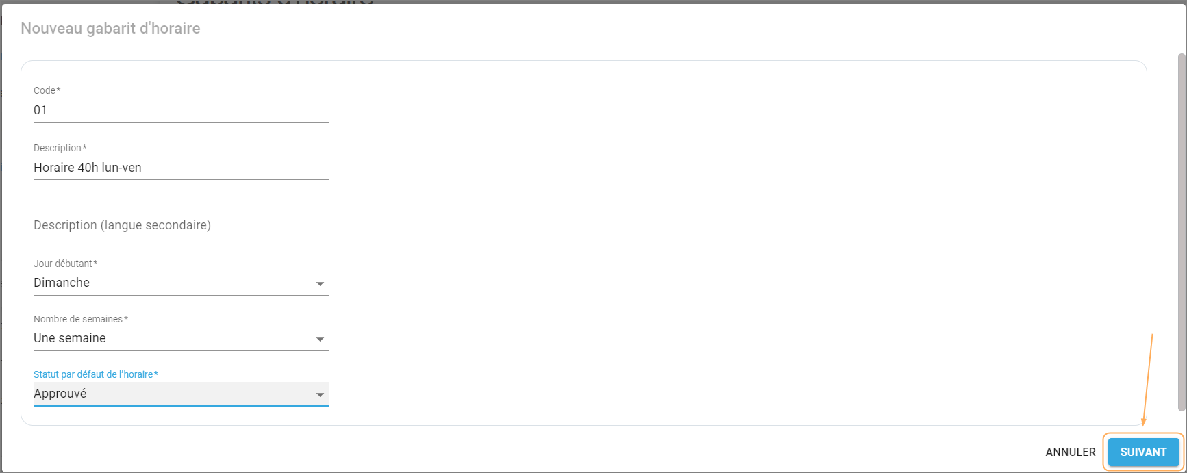 Le champ description permet d'entrer le nom que vous voulez donner à votre gabarit. Le champ description langue secondaire est facultatif et permet d'entrer la description dans la langue secondaire de l'entreprise.