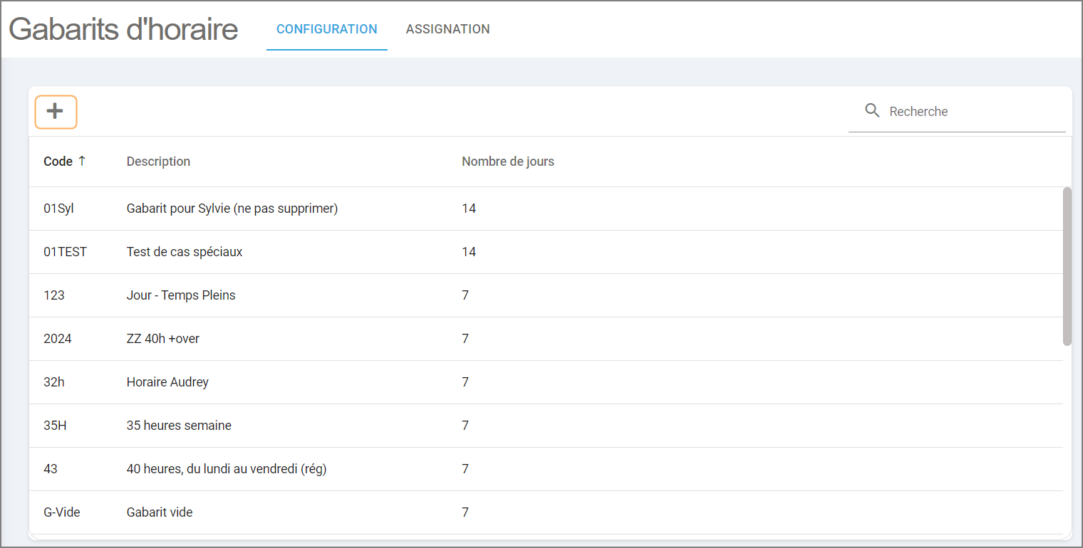 Accédez à la page Gabarits d'horaire via la section administration du menu principal. Vous devez vous positionner sur l'onglet Configuration.