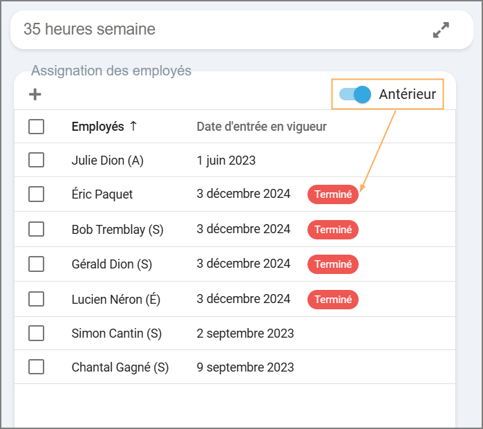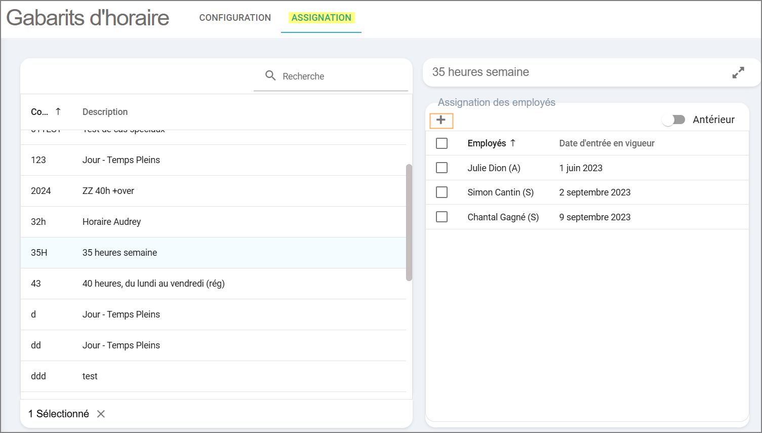 Dans cette grille, cliquez sur le , et sélectionnez le ou les employé(s) que vous souhaitez assigner à ce gabarit.