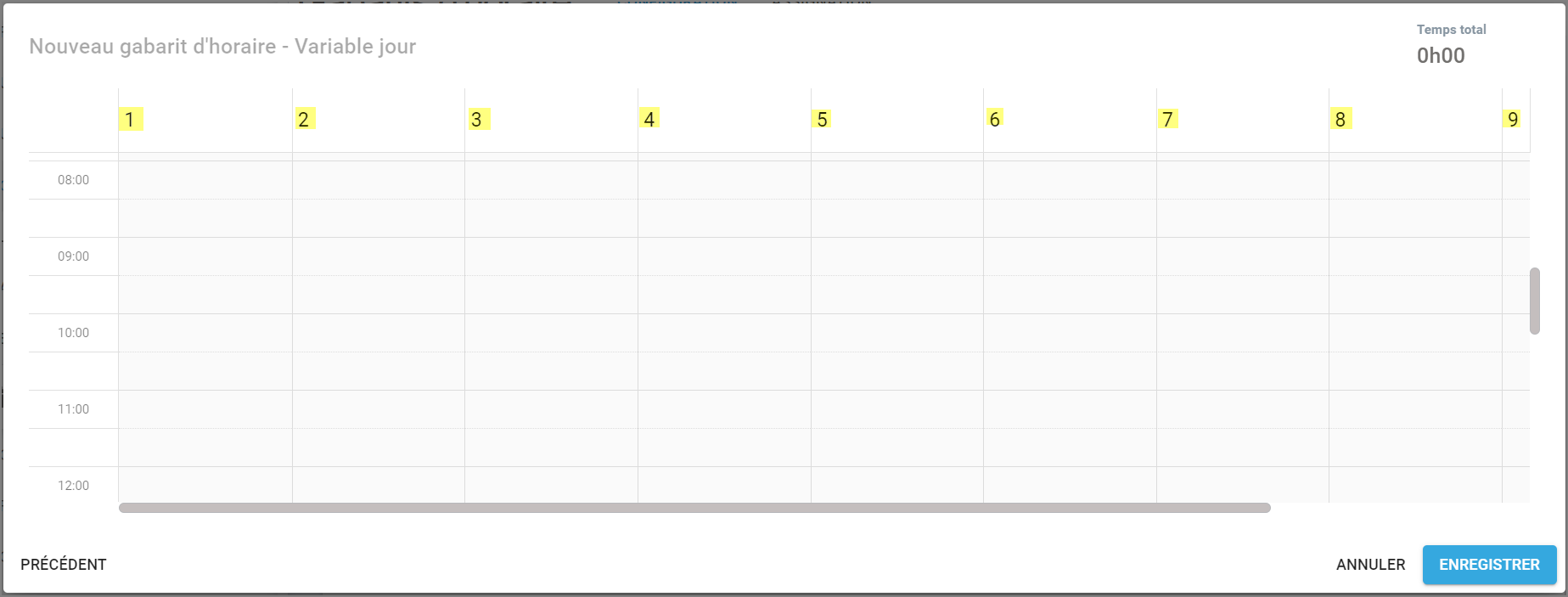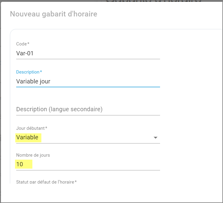 Si votre gabarit ne commence pas un jour précis de la semaine, vous devez sélectionner le champ Variable. Comme cela lorsque vous allez configurer le gabarit à la prochaine étape, ce ne sera pas inscrit lun, mar, mer, mais bien 1, 2, 3 puisque ce gabarit n'est pas fixe, il n'est donc pas attitré à des journées de la semaine fixe. Le système vous demandera ainsi quelle est la durée de votre gabarit.