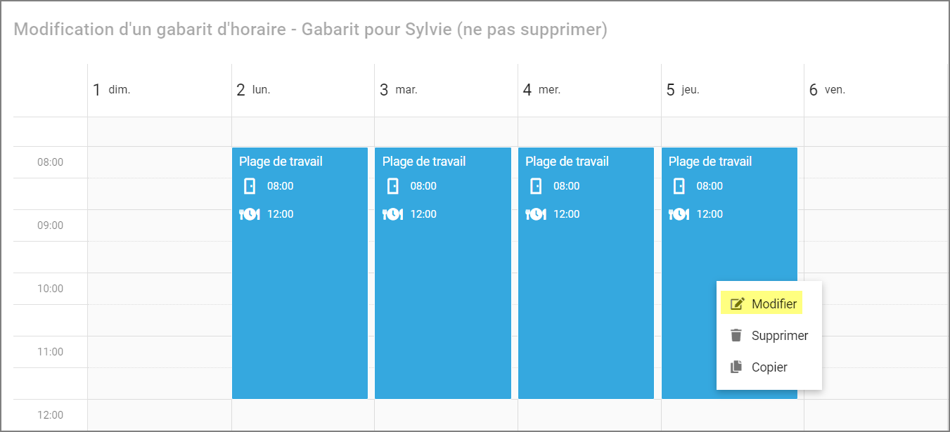 C'est une modification qui s'applique à un poste et cette modification sera récurrente de semaine en semaine. Ex. Le poste de serveur jour débutait à 8h00 AM, mais maintenant, le restaurant ouvre plus tard et les employés de ce poste de travail commenceront à 9h30 AM. Dans cette situation, vous devez apporter la modification dans le gabarit d'horaire du poste de serveur jour.