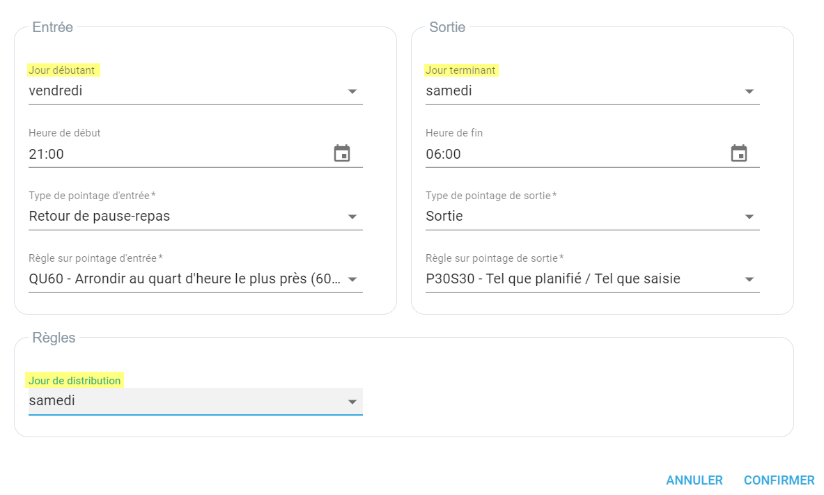 Vous pouvez ajouter une plage horaire qui s'étend sur deux journées. Dans ce cas, lorsque vous sélectionnez l'heure de fin dans le calendrier, vous devrez sélectionner une heure passée minuit. Dans ce cas, le système automatiquement vous demandera quel est le jour terminant. Finalement, vous devrez indiquer quel est le jour de la distribution. Ceci correspond au jour à laquelle vous désirez que les heures soient comptabilisées dans la distribution.