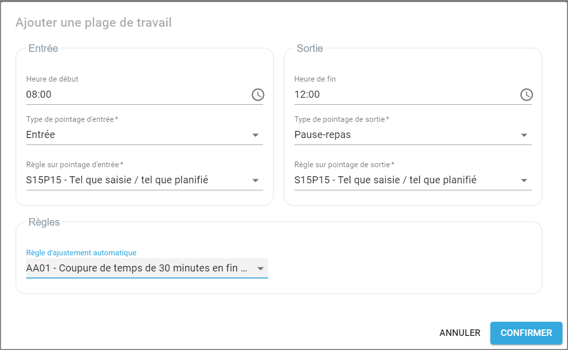 Le type de pointage d'entrée correspond au type attendu lors du pointage de l'employé sur l'horodateur selon les conventions de votre entreprise. (Entrée ou retour de pause-repas)