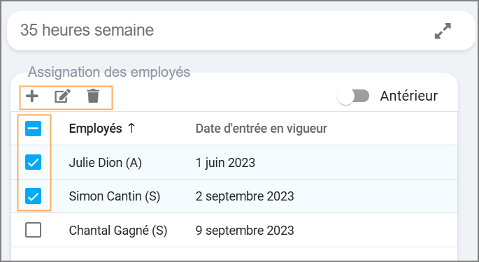 Finalement, vous pouvez en tout temps sélectionner des employés dans la grille et modifier la date d'entrée en vigueur du gabarit. Vous pouvez également supprimer des employés de la grille en cliquant sur l'icône de poubelle.