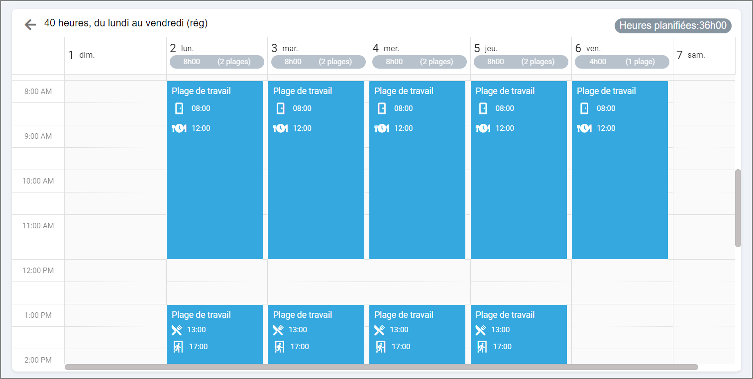 Dans l'écran de visualisation du gabarit d'horaire, vous pouvez voir facilement les plages qui s'étendent sur 2 journées. Elles seront indiquées par des flèches afin de démontrer la continuité de la plage sur une autre journée.