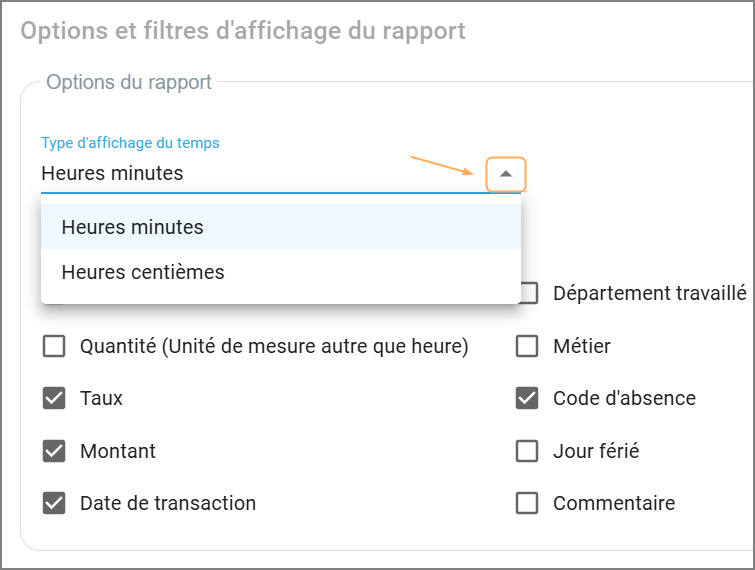 Dans ce champ, vous pouvez choisir de sortir le rapport en "Heures minutes" ou en "Heures centièmes". Vous faites ce choix en utilisant le menu déroulant avec la petite flèche à droite dans le champ Type d'affichage du temps. Il peut être utile de sortir les temps en heures centièmes pour valider l'exportation des temps à votre logiciel de paie. Ceux-ci fonctionnent souvent en heures centièmes.