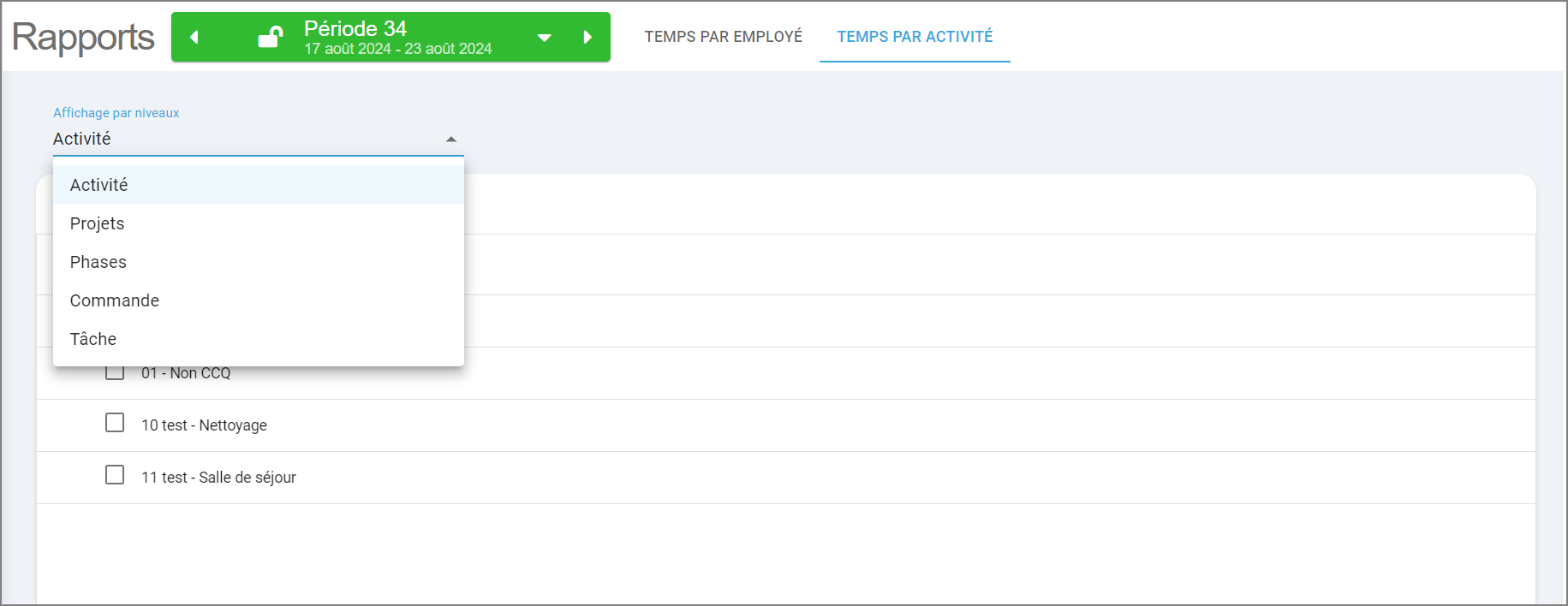 Vous devez d'abord choisir quel type de rapport vous avez besoin. Vous avez le choix pour le moment, entre 2 types soit Temps par employé ou Temps par activité.