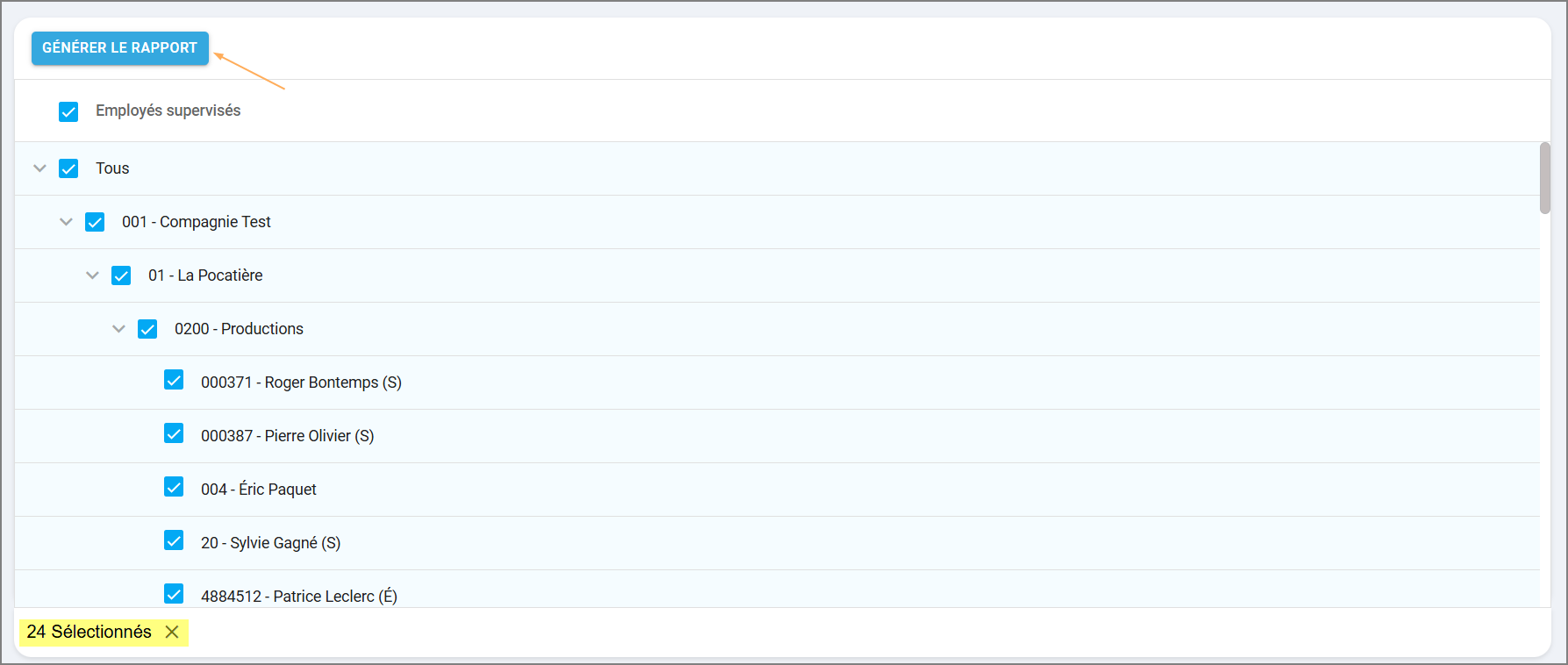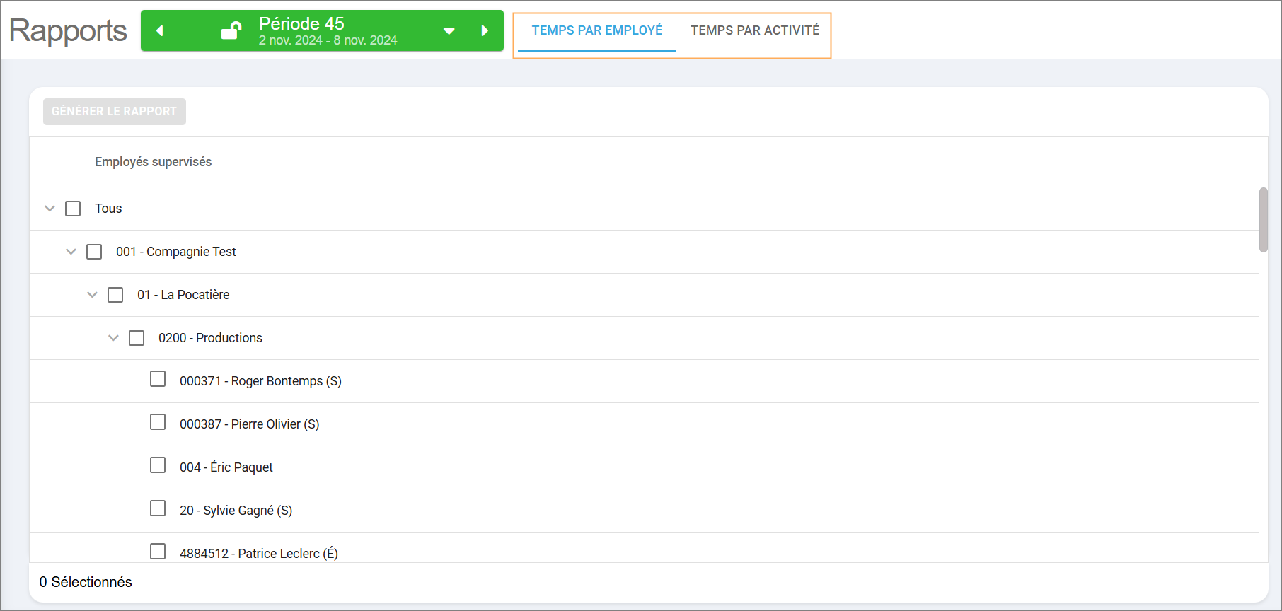 Sélectionnez le ou les employé(s) ou l'entité de la structure organisationnelle que vous souhaitez inclure dans le rapport, puis cliquez sur le bouton Générer le rapport pour afficher le rapport souhaité.