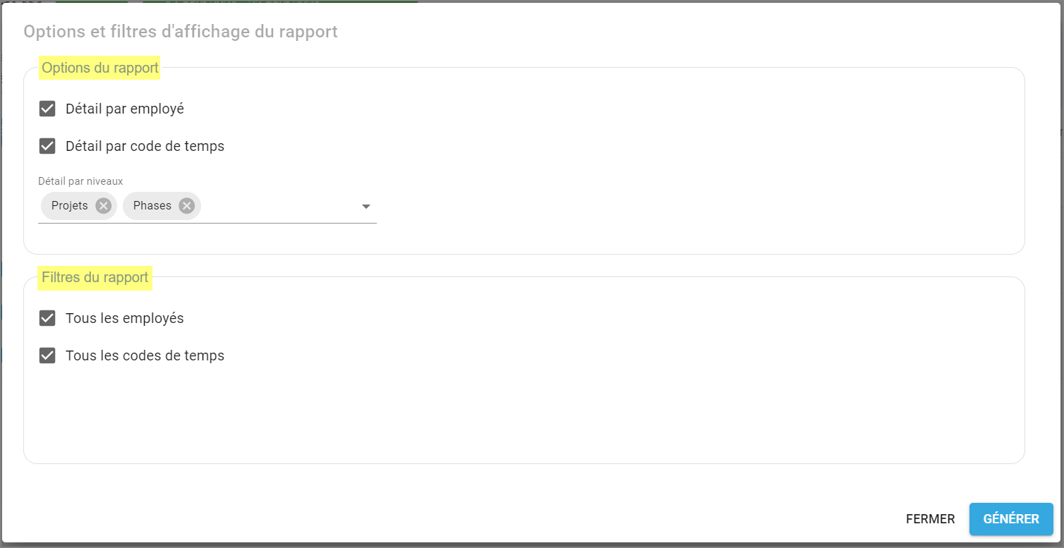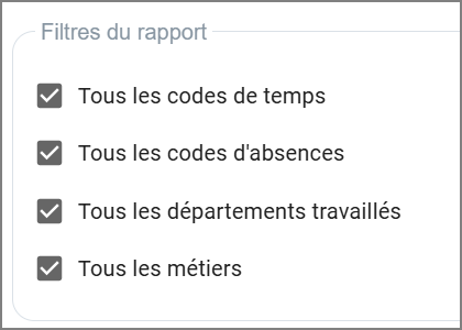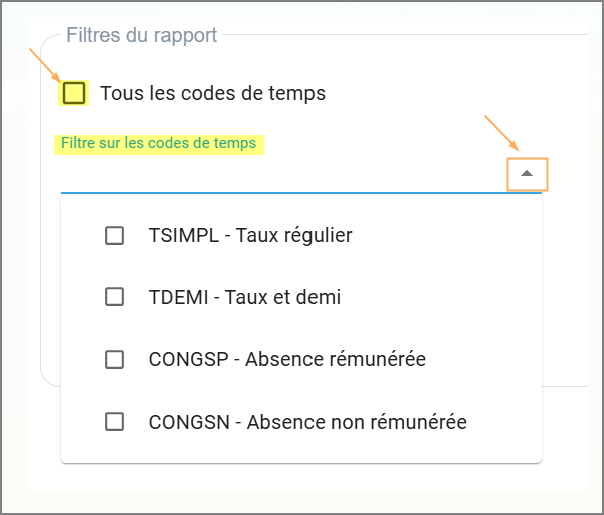 Dans la section Filtres du rapport: Vous pouvez choisir "Tous les employés et/ou Tous les codes de temps". Si vous désirez afficher seulement un employé ou un code de temps, vous devez décocher la case et ensuite utiliser la recherche pour cocher uniquement l'employé ou le code dont vous voulez consulter.