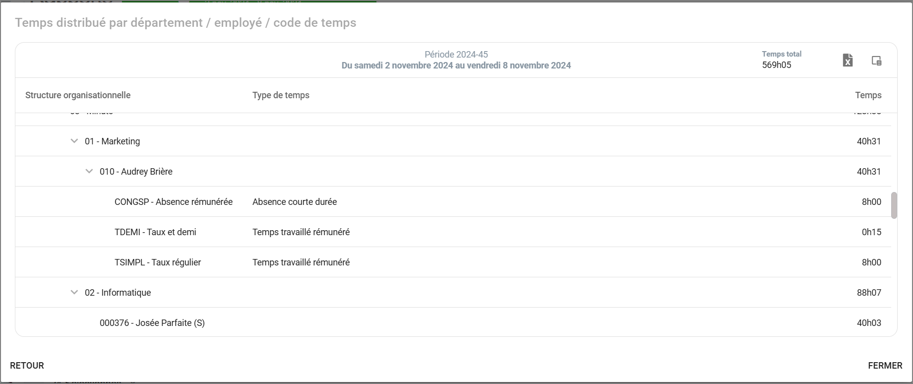 Vous aurez alors votre rapport à l'écran avec la même structure que le rapport "Temps par employé".