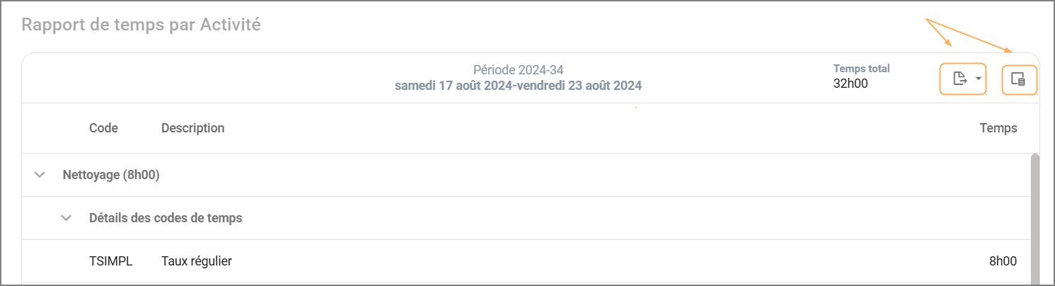 Dans cette section, vous pouvez afficher les temps distribués par activité incluant tous les jalons et termes utilisés par votre entreprise.