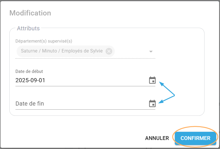 Une fois votre ou vos départements supervisés ajoutés, vous pouvez en tout temps venir modifier la date de début et la date de fin, ou en ajouter une lorsque l'information n'était pas disponible lors de la création.
