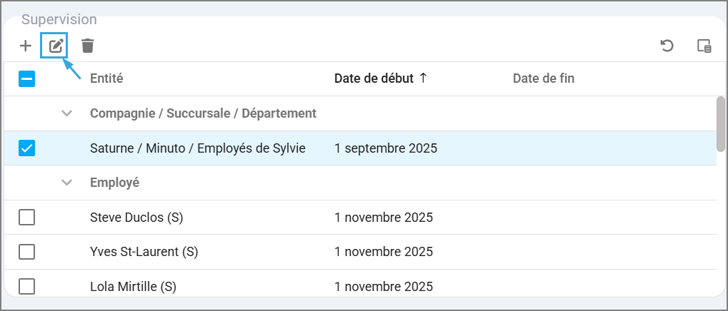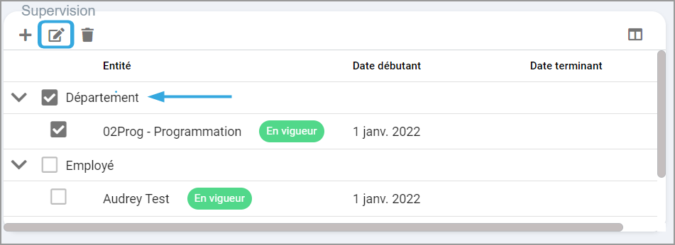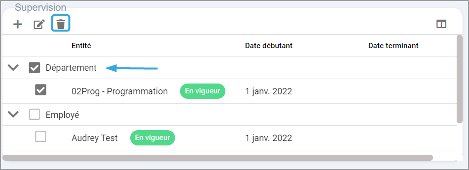 Il est également possible de supprimer un département supervisé, un employé ajouté à la supervision ou un employé exclu de la supervision. Pour ce faire, vous devez sélectionner l'élément désiré et cliquer sur l'icône de poubelle.