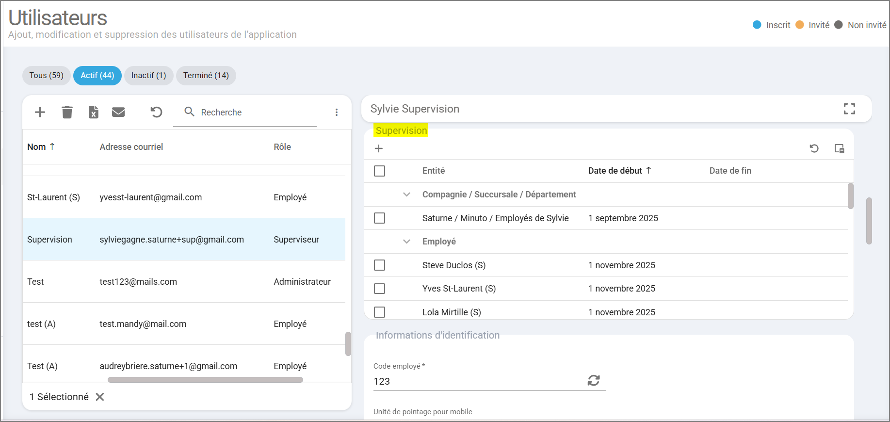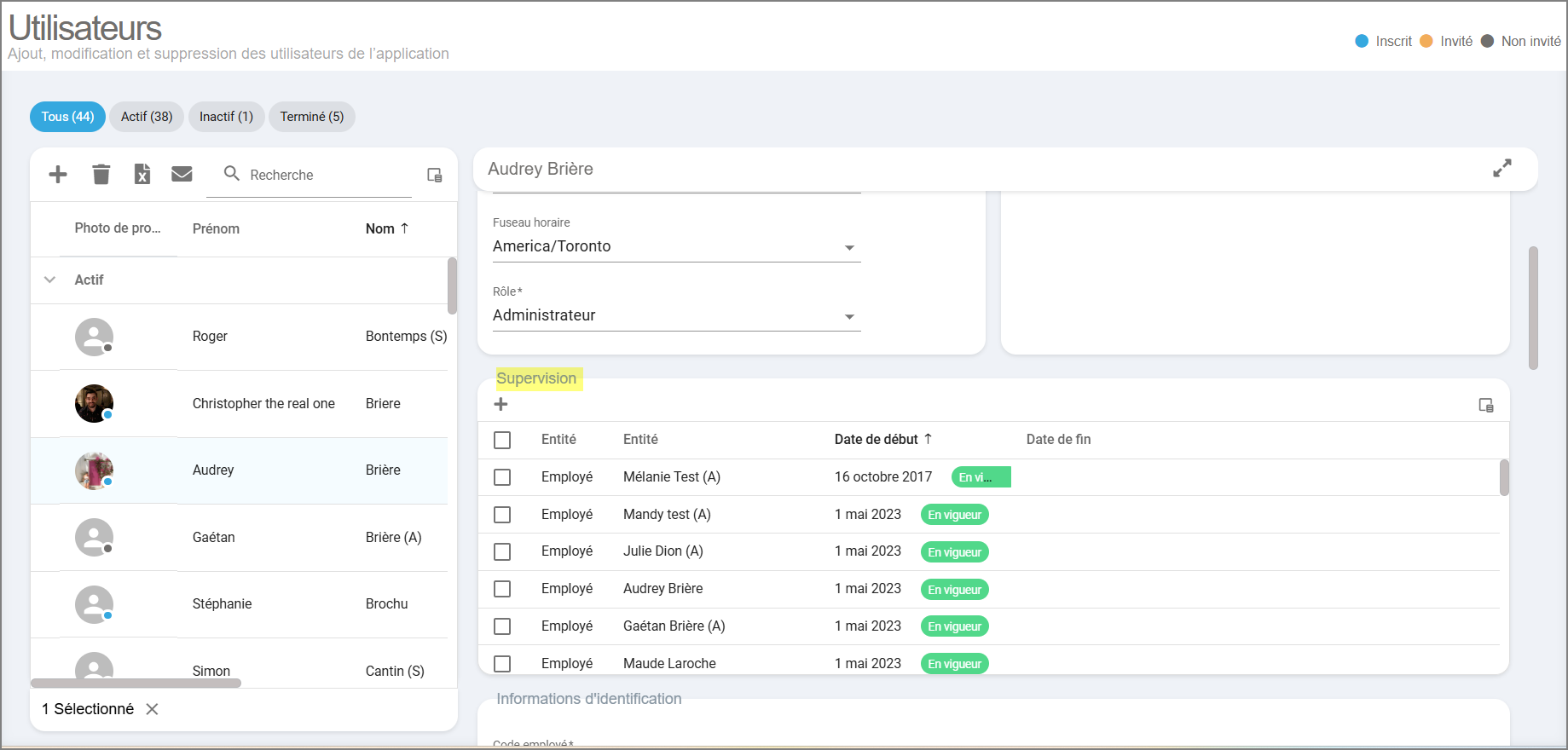 Les droits d'accès dans le système ont des fonctions importantes. C'est le cas des superviseurs qui peuvent sélectionner des départements et même des employés qu'ils superviseront. Ils devront entre autres s'occuper du cycle hebdomadaire du traitement des feuilles de temps dans l'application pour ces employés, pour avoir plus de détails sur les éléments supervisés, veuillez consulter cette page.