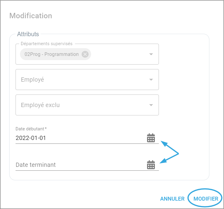 Une fois votre ou vos départements supervisés ajoutés, vous pouvez en tout temps venir modifier la date débutant et la date terminant ou en ajouter une lorsque l'information n'était pas disponible lors de la création.