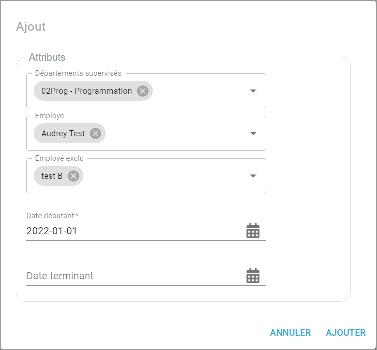 Il est important de noter que seulement les superviseurs et administrateurs peuvent avoir des départements supervisés. C'est pourquoi vous devez effectuer, via la page Utilisateur, la gestion des droits d'accès et attribuer la fonction de superviseur aux personnes concernées.