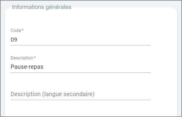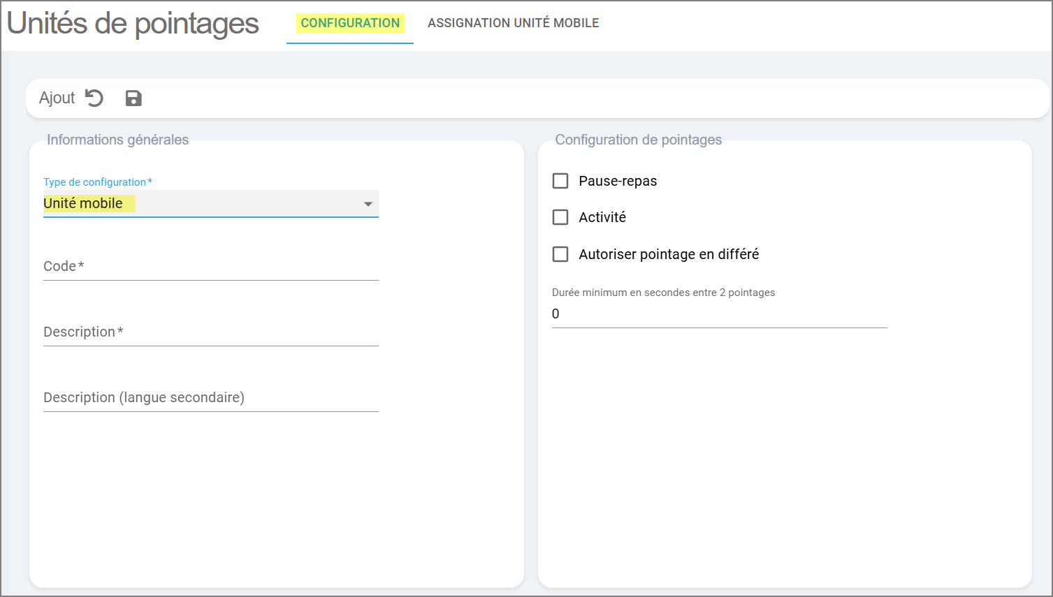 Accédez à la page Unités de pointages via la section Administration du menu principal puis cliquez sur le en haut à gauche de la fenêtre active. Une page s'ouvrira alors et vous pourrez compléter les champs qui s'affichent en vous référant au besoin aux informations ci-bas. Ensuite cliquez sur