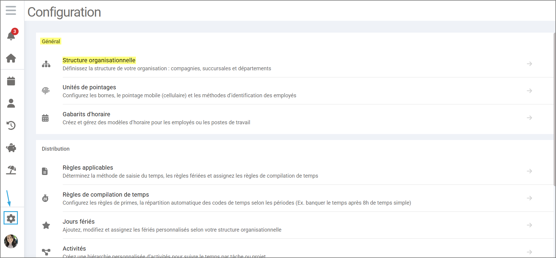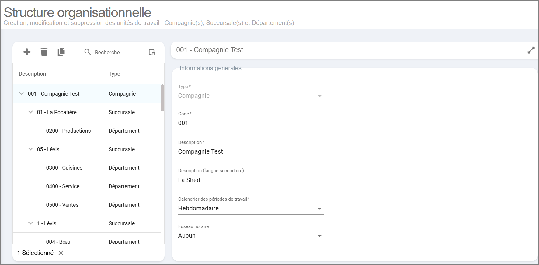 L'intégration de votre structure organisationnelle dans l'application permet une gestion plus efficiente des employés et des équipes. Plusieurs fonctions se réfèrent à cette structure, notamment celles relatives à la supervision ainsi que toutes les actions de traitement en lot. Cette section vous permettra aussi d'attribuer les valeurs par défauts devant s'appliquer pour l'ensemble des employés d'un groupe telles que le fuseau horaire et le format du calendrier des périodes de travail.