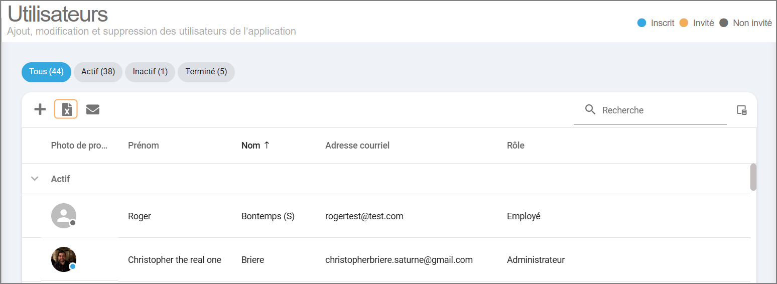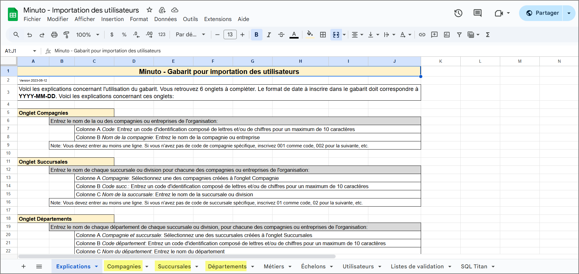 L'importation des informations contenues dans le gabarit d'implantation se fera à partir de cette icône qui est en haut à gauche de la page Utilisateurs (icône d'un document avec un x dessus). Dans ce fichier on retrouve notamment tout ce qui est en lien avec vos employés, votre structure organisationnelle ainsi que vos métiers et échelons.