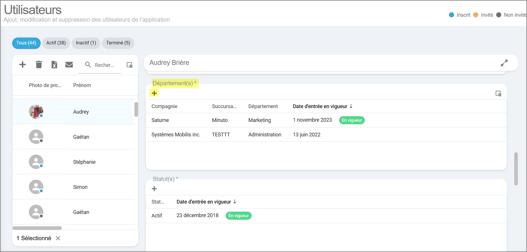 Pour assigner une cie/succ./dépt. à un employé il faut se rendre dans la page Utilisateurs de la section Administration du menu principal. Sélectionnez l'utilisateur en question et dirigez vous dans la section Département. Vous devez cliquer sur . Une fenêtre apparait avec une liste déroulante vous proposant tous les départements que vous avez créés en fonction des succursales et des compagnies. Vous pourrez donc assigner le dépt./succ./cie à l'employé à partir de ce menu.