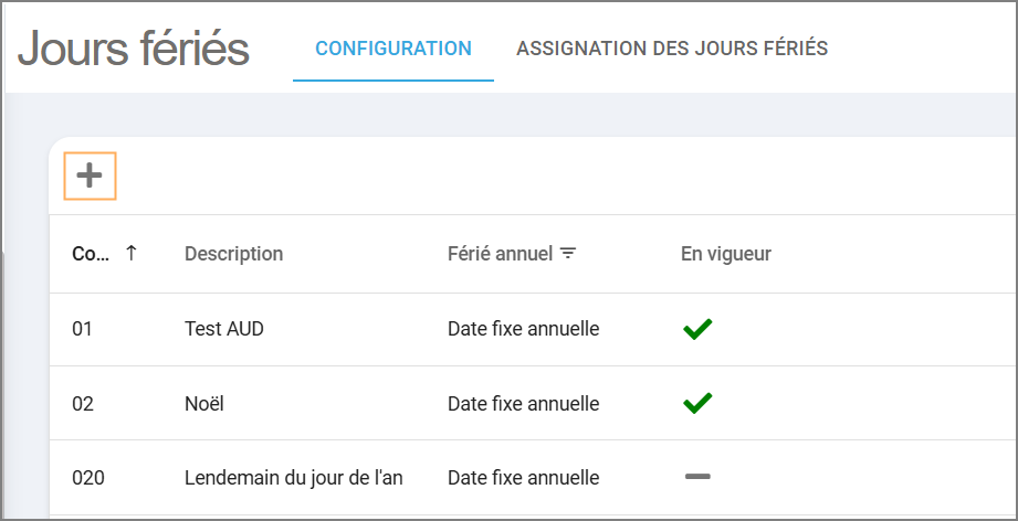 Pour ajouter un férié cliquez sur le en haut à gauche de la fenêtre active.