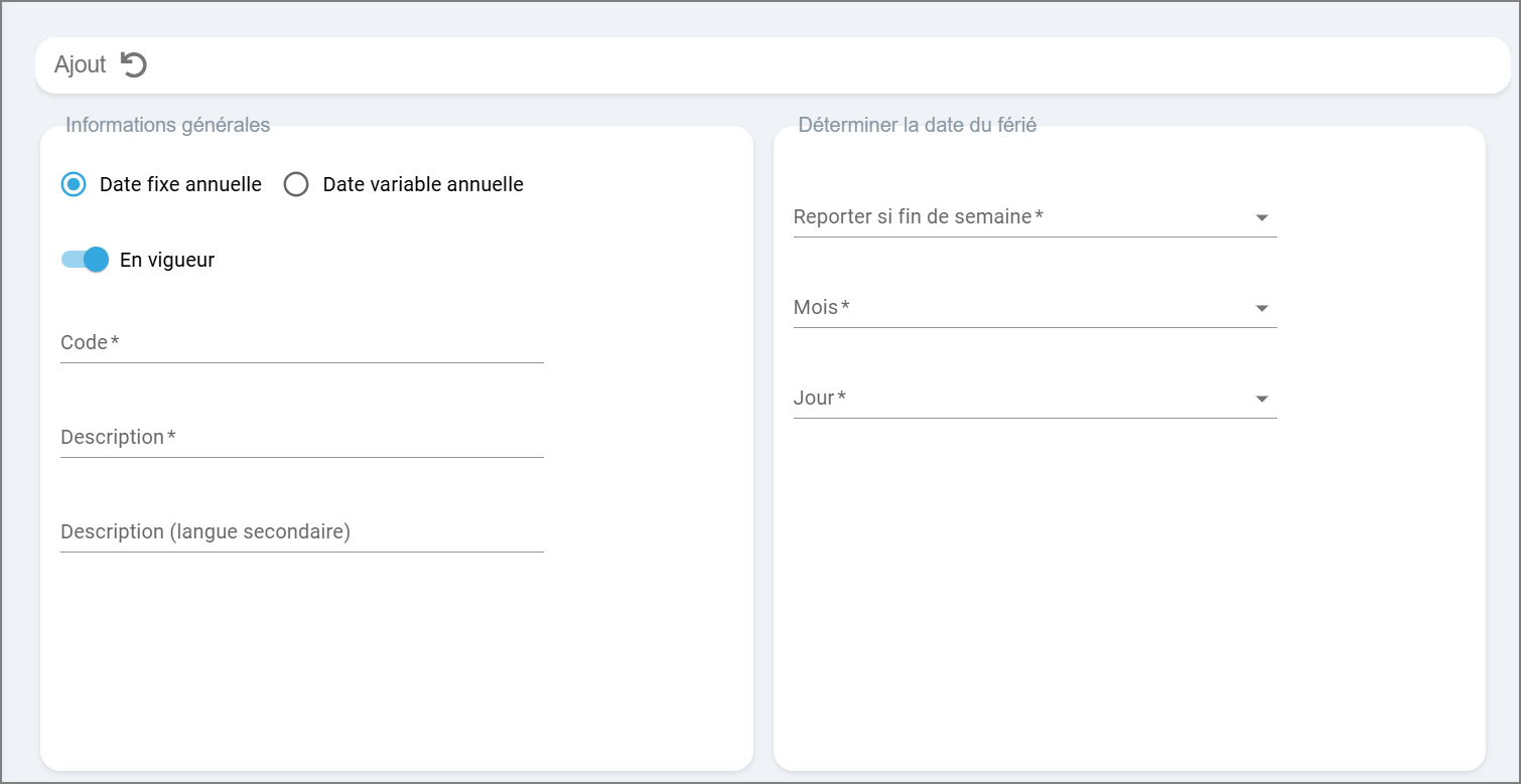 Permets d'attribuer une date fixe à un jour férié, ex. Noël, la fête du Canada ou bien une data variable annuelle comme la fête du travail ou l’action de grâce.